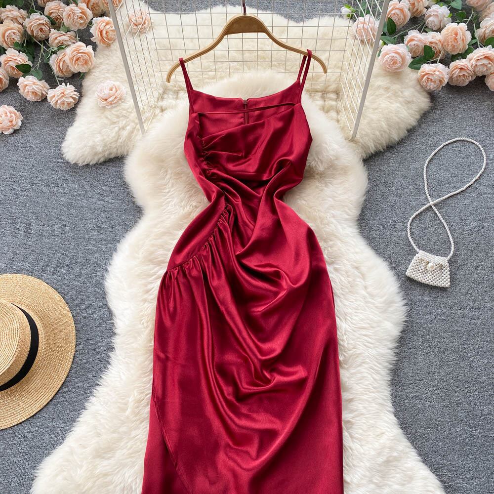 高品質シルキーサテンイレギュラーサスペンダースカートレディーススモールドレススカートプリーツウエストライトラグジュアリーレディドレス lyxaj63884273562