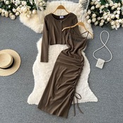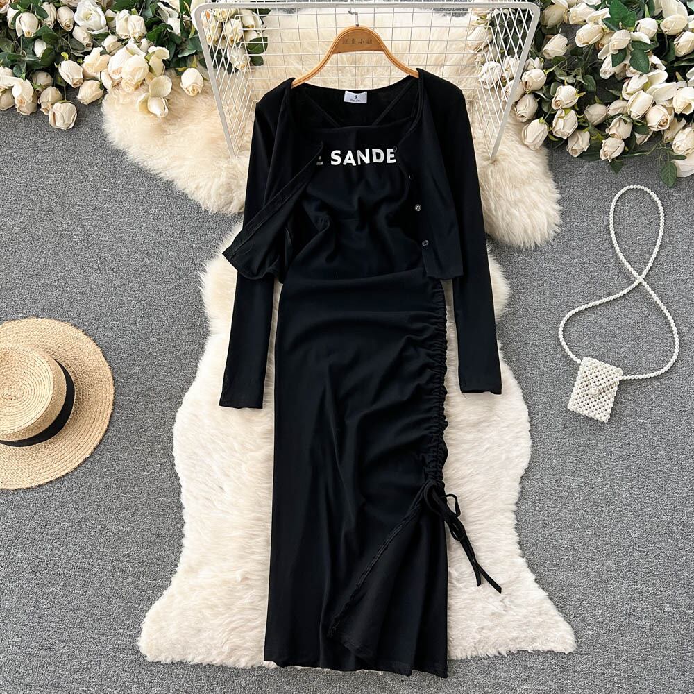 ファッショナブルでファッショナブルなツーピース スーツ女性の秋長袖カーディガン コート巾着スリム サスペンダー ドレス トレンディ ロング オータム 秋物 lyxaj12589442187