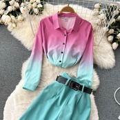 ヨーロッパとアメリカのインファッションスーツレディースグラデーション長袖シャツスーツレディースカジュアルストレートワイドレッグパンツ2点セット ロング ヨーロピアン lyxaj2984102495