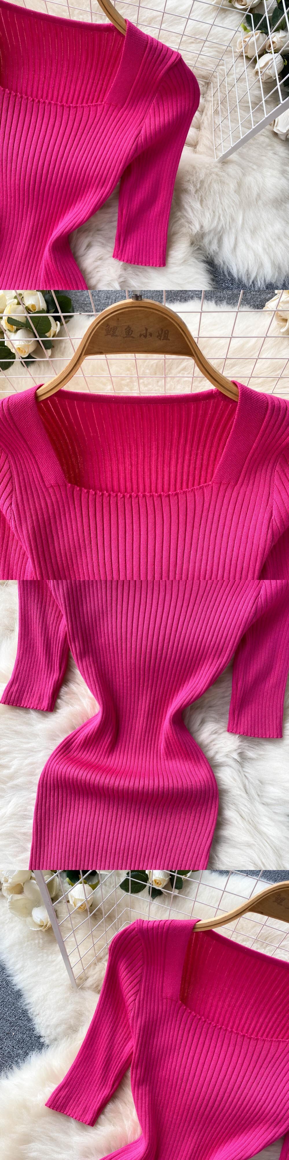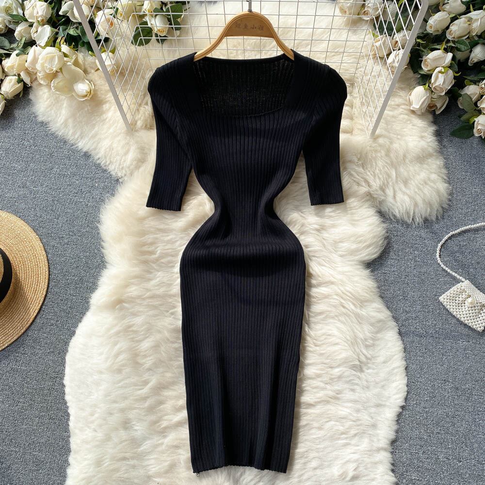 シンプルなソリッドカラーの気質スクエアカラースリムショートパッケージヒップスカート半袖ニットドレス夏の女性のタイトスカートの韓国語バージョン サマー 夏物 スクウェア lyxaj53568712588