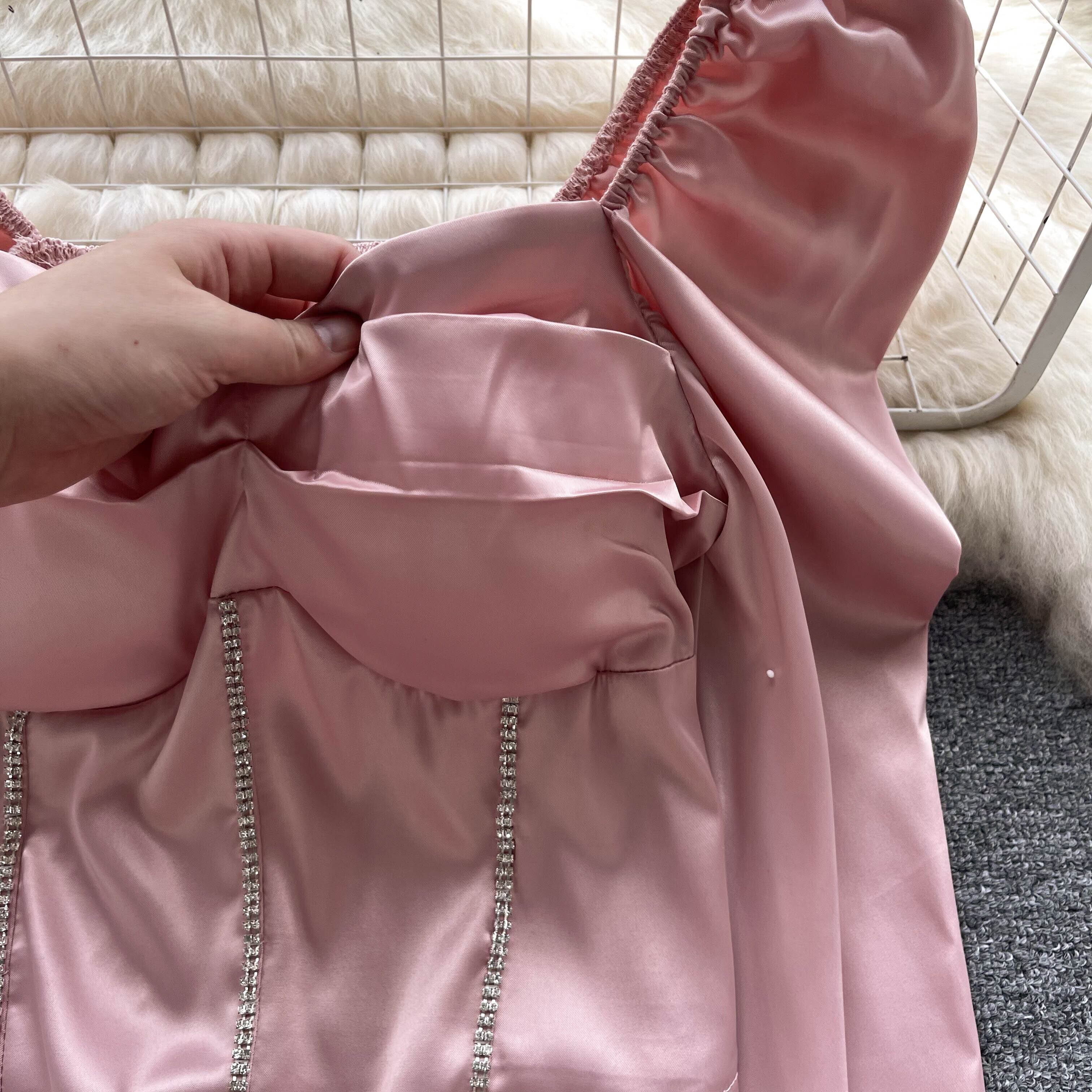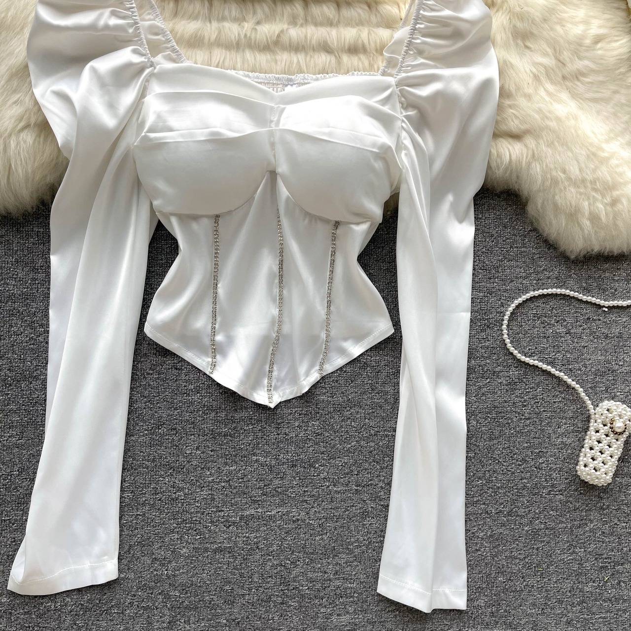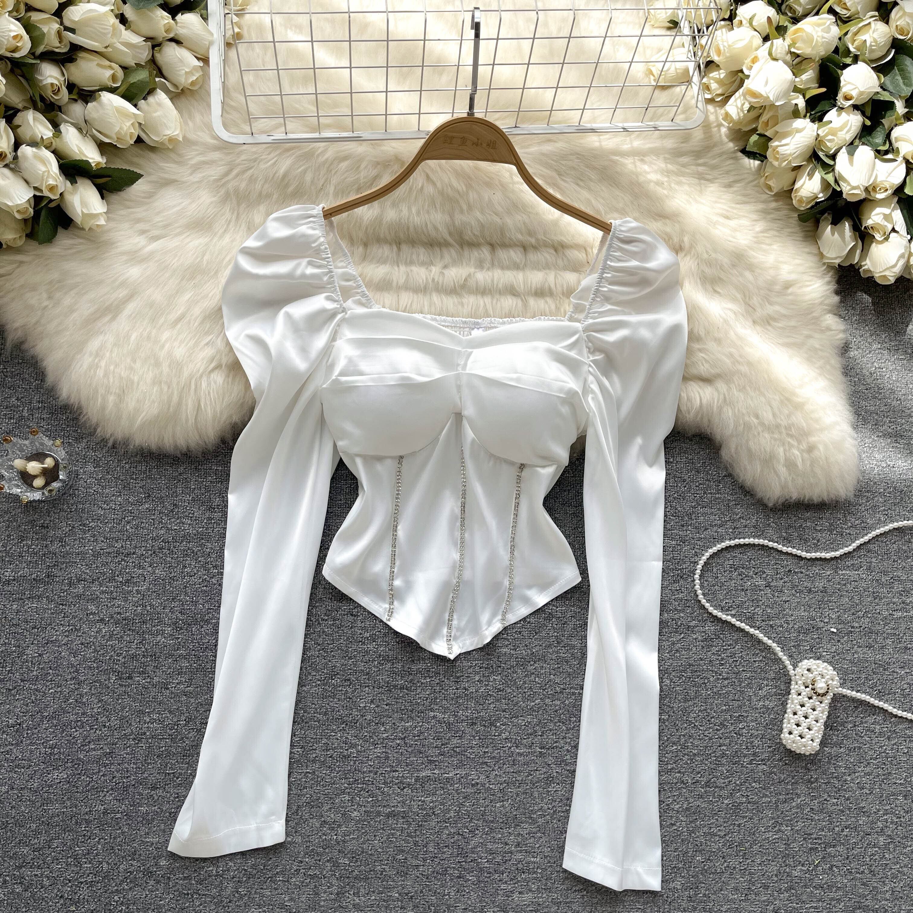 Celebrity temperament design sense niche beaded puff sleeve shirt top autumn women's scheming square collar short shirt ショート オータム 秋物 スクウェア lyxaj84842726016