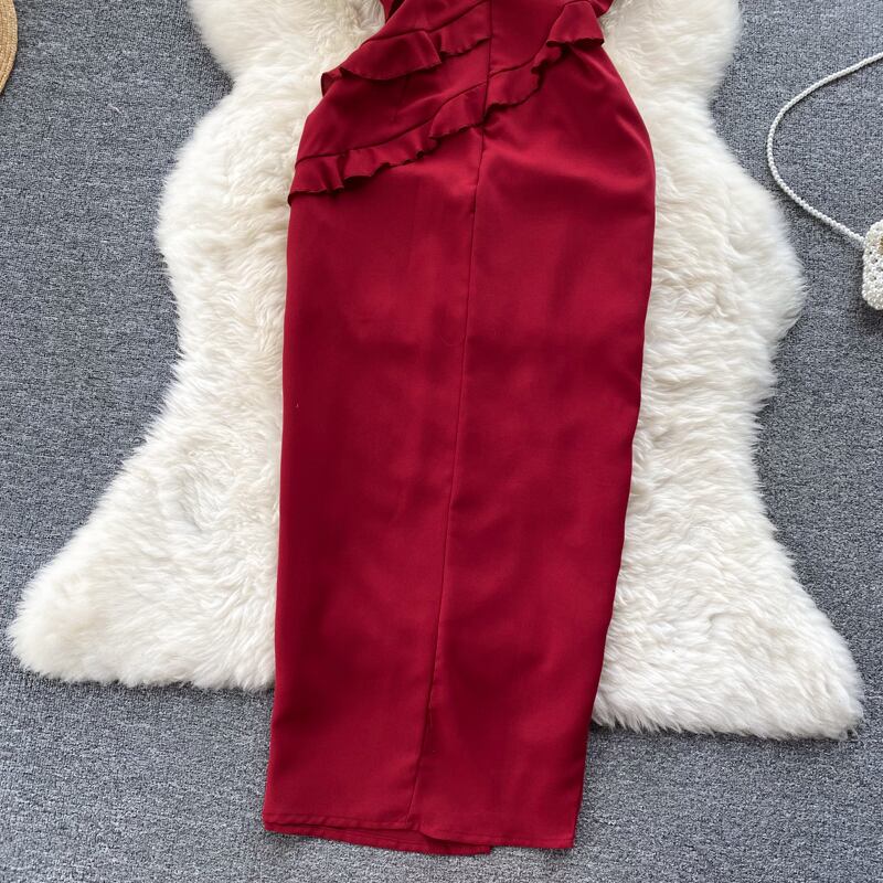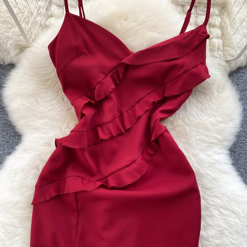 夏の新デザイン感レトロアセテートサテンレッドサスペンダードレスウエストが細くヒップスリットスカート サマー 夏物 lyxaj3736521928