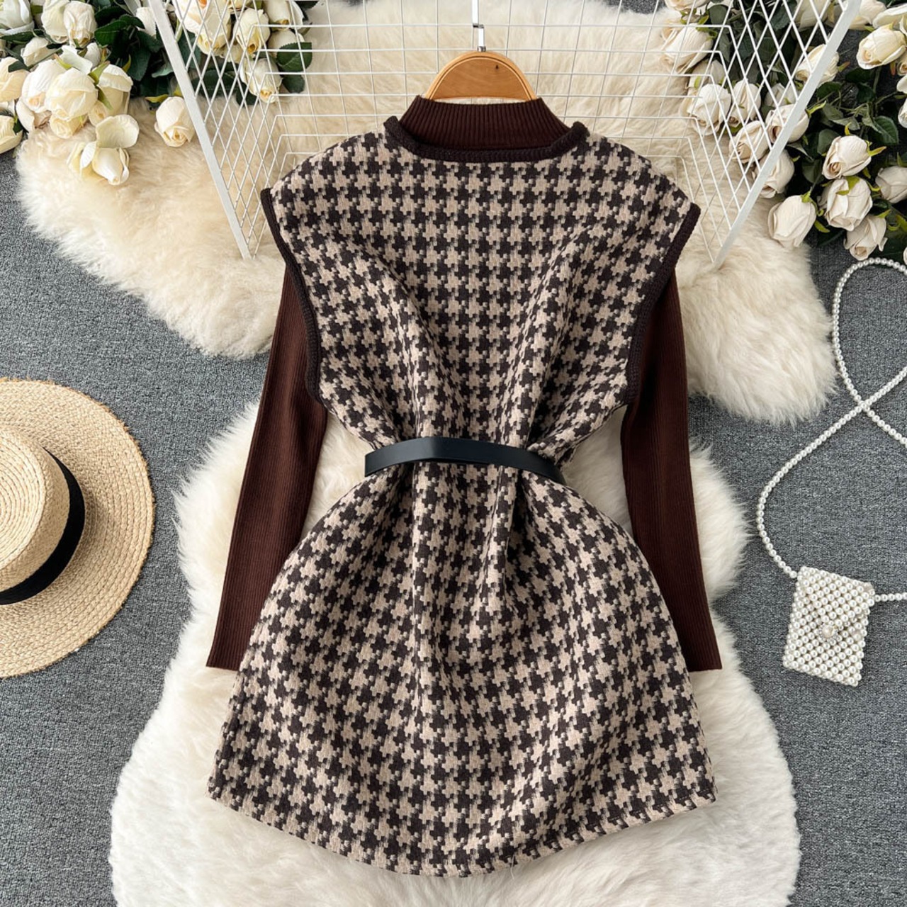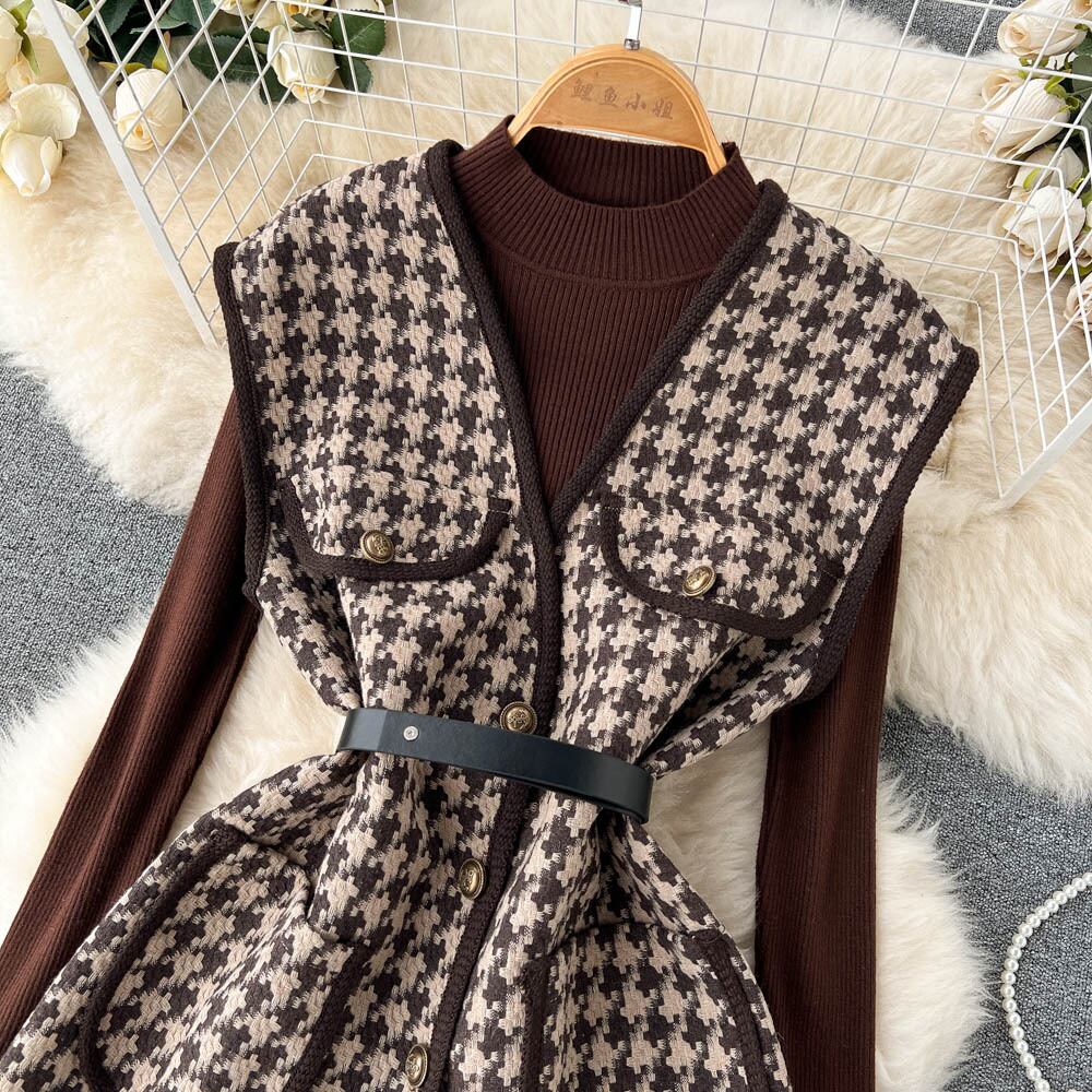 Xiaoxiangfeng ツーピース スーツ女性の秋のハイエンド千鳥格子ベスト コート スリム長袖セーター トップ トレンディ ロング オータム 秋物 lyxaj96992533494