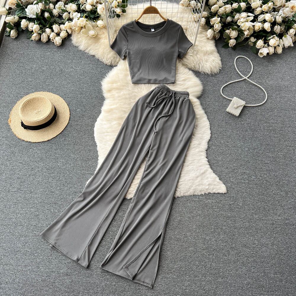 カジュアルスーツ レディース 夏 新作 ショート 半袖 Tシャツ クロップドトップス ハイウエスト ワイドパンツ ツーピース トレンド サマー 夏物 lyxaj69408641203