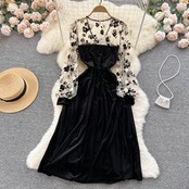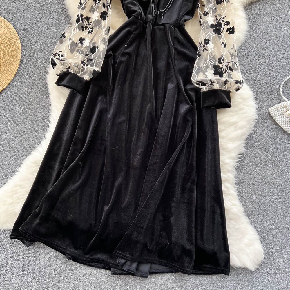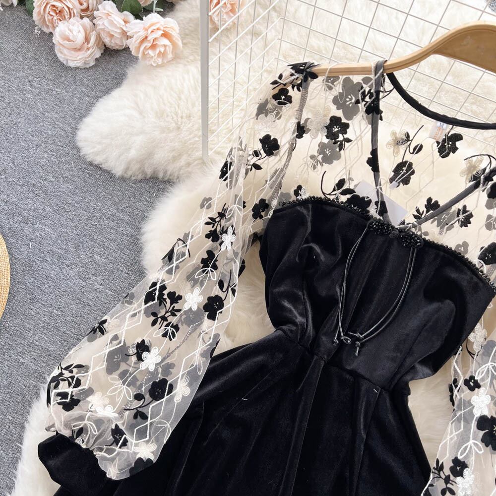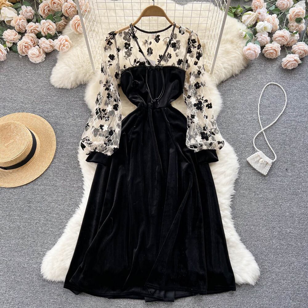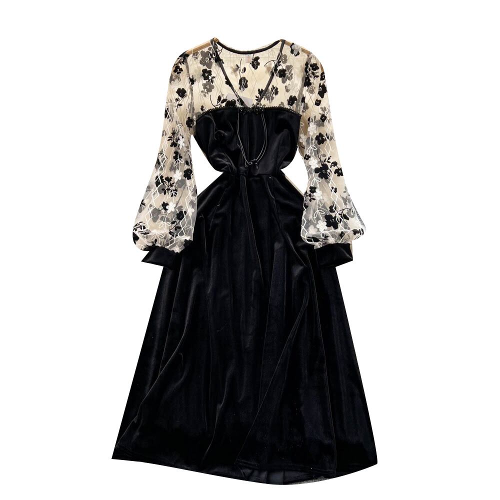 French retro design sense niche print long-sleeved hollow dress autumn women's beautiful waist small black dress ロング ブラック レトロ オータム 秋物 lyxaj50081562443