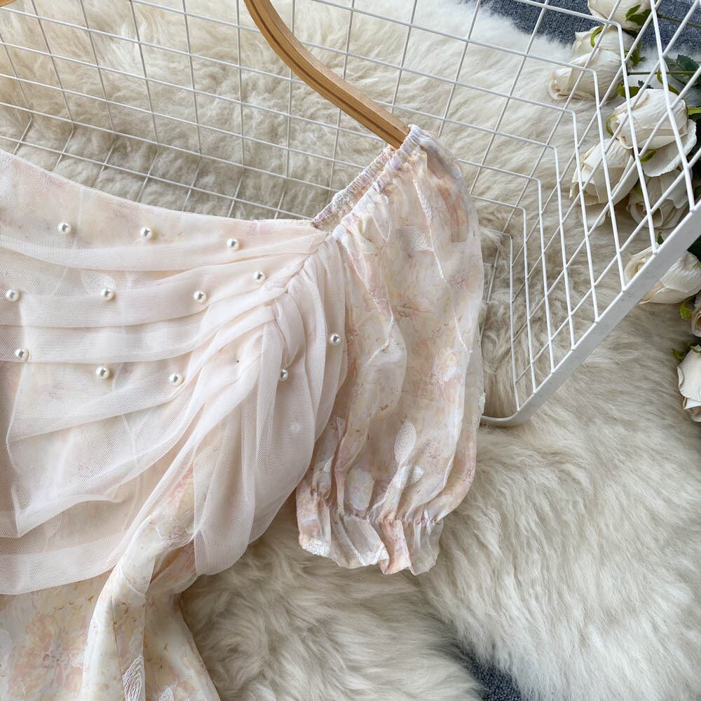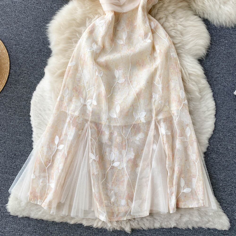 Mesh embroidery fleeing princess dress waist slim puff sleeves gentle wind super fairy age reduction big swing A-line skirt 刺繍 メッシュ スカート Aライン スリム lyxaj66772495857