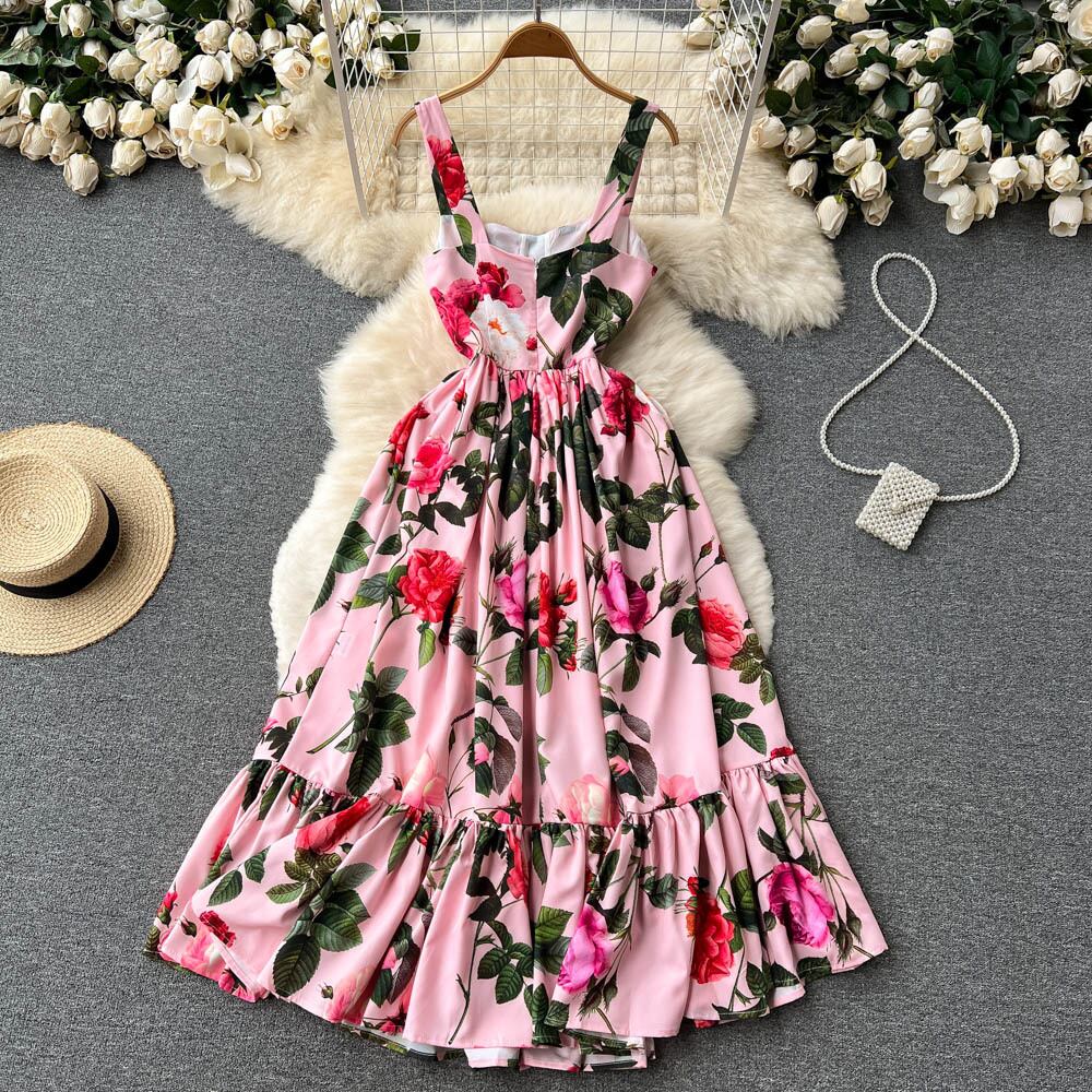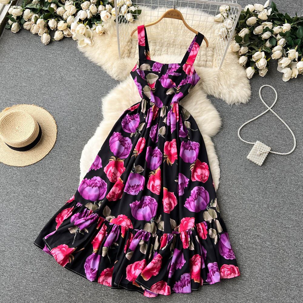 2022 夏新スウィートフローラルスクエアネックドレス気質女神ファンハイウエストと薄いスーパー妖精ビッグスイングドレス ハイウェスト 大人ガーリー キュート カジュアル サマー 夏物 花柄 スクウェア lyxaj63479734748