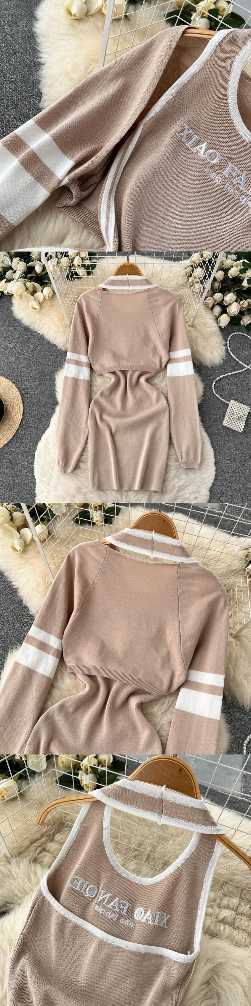 Net red two-piece suit women's early autumn long-sleeved knitted shawl coat contrasting color halter vest dress ロング レッド オータム 秋物 lyxaj61119171317