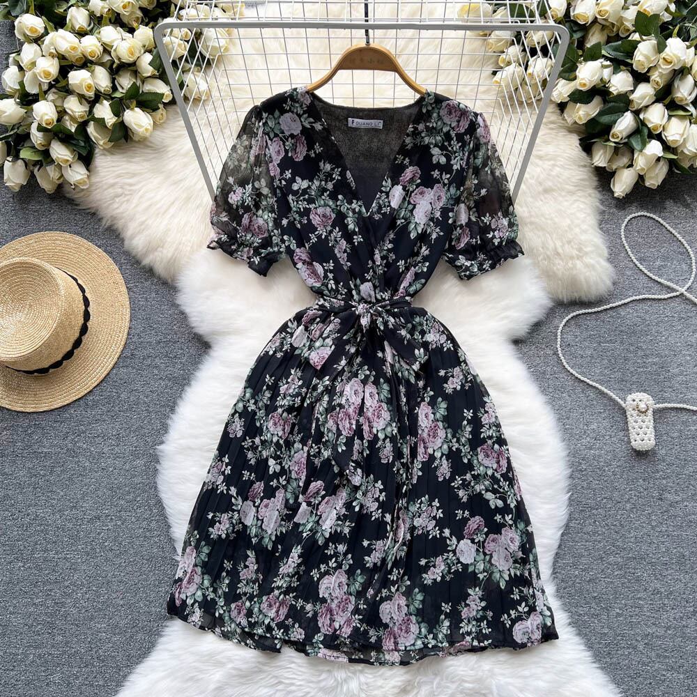 気質Vネックハイウエストタイウエスト花柄パフスリーブスモールショートスカートフレンチティーブレイクシフォンドレス女性 ハイウェスト lyxaj92412129346