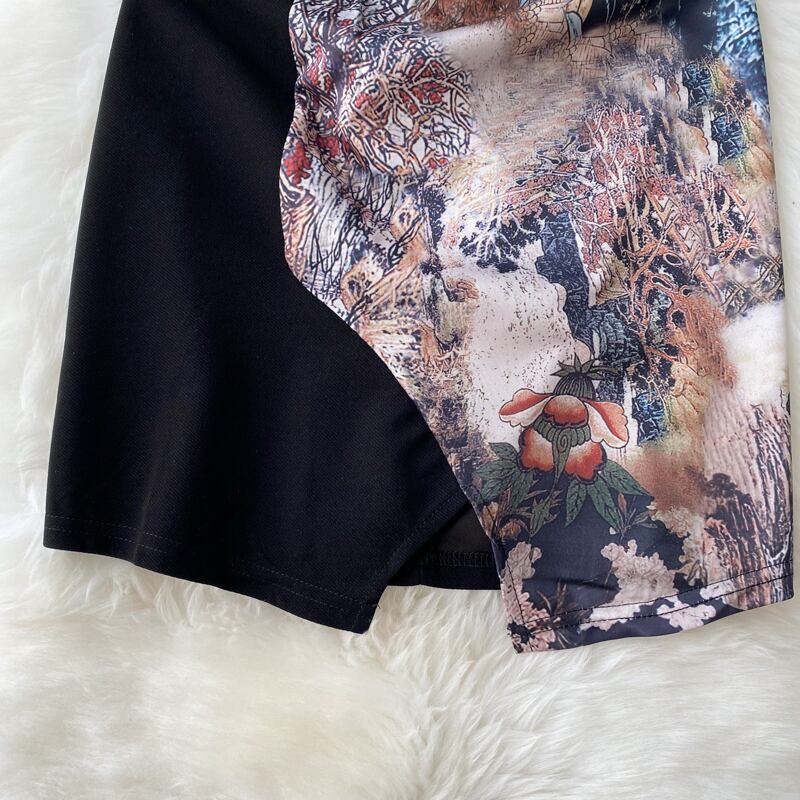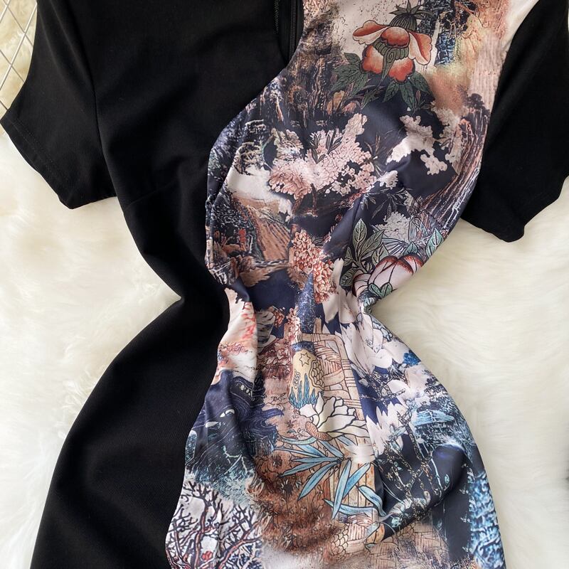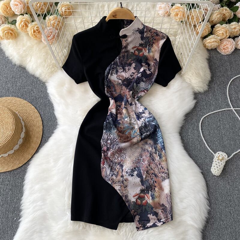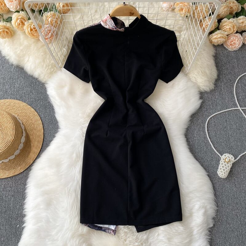 ダークな女性のドレス夏の女性のデザインの小さなコントラストの色の継ぎ合わせスリムフィットショート改良されたチャイナ ドレス スカート サマー 夏物 lyxaj38589797586