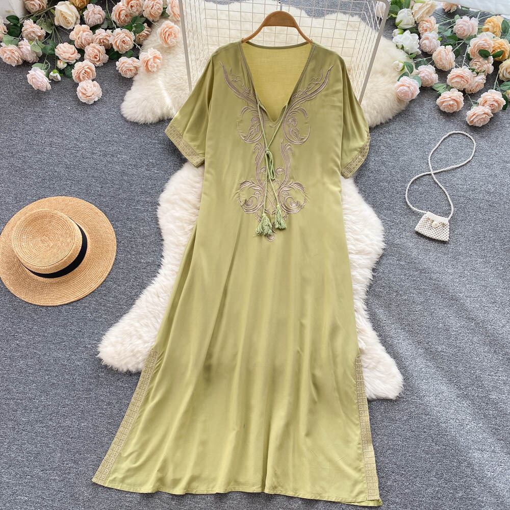 高品質の寒風刺繍 V ネック ドレス夏の女性のエスニック スタイルゆったりと薄い半袖ミドル丈スカート レッド サマー 夏物 Vネック lyxaj39060594479