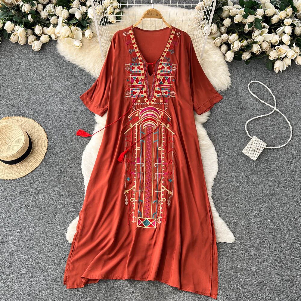 エスニック風ニッチデザイン刺繍Vネックドレス夏レディースフレンチシックキレイめゆったり半袖ロングスカート レッド サマー 夏物 lyxaj33876881066
