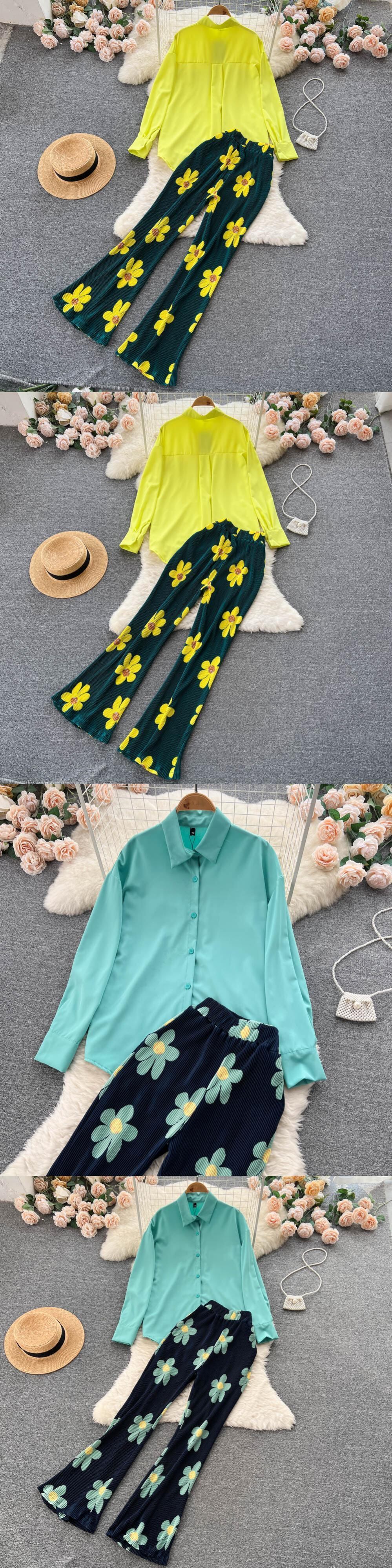 ファッショナブルでファッショナブルなツーピーススーツ女性の秋の気質長袖シャツトッププリントゆったりワイドレッグロングパンツ オータム 秋物 lyxaj98179348815