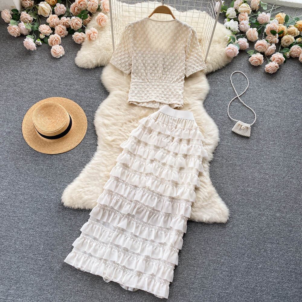 今年人気の美しいツーピーススーツ女性の夏の女性の気質スクエアネックのシャツにフリンジ付きのハーフレングスのスカート サマー 夏物 スクウェア lyxaj12151663054