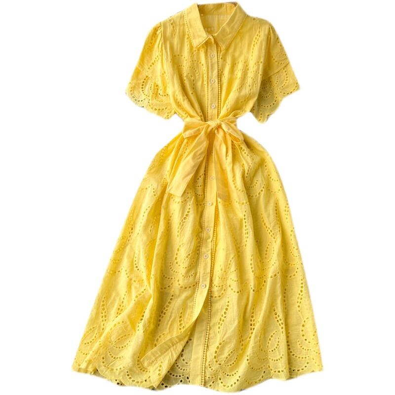 スカート 優しい風 ラペル パフスリーブ ミドル丈 シャツスカート レースアップ 薄手 中空デザイン フレンチドレス lyxaj35737912716