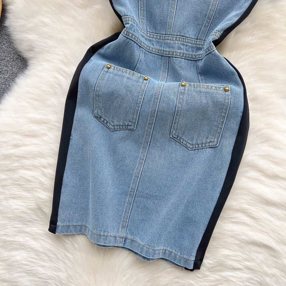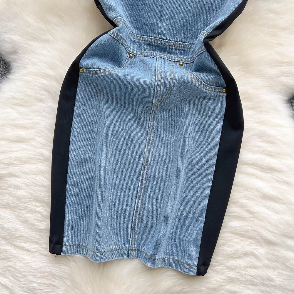 韓国版 シックなデザイン ステッチデニム 半袖 Tシャツ ワンピ レディース スリム スリム バッグ ヒップ ショート スカート 小さめ lyxaj35850615152
