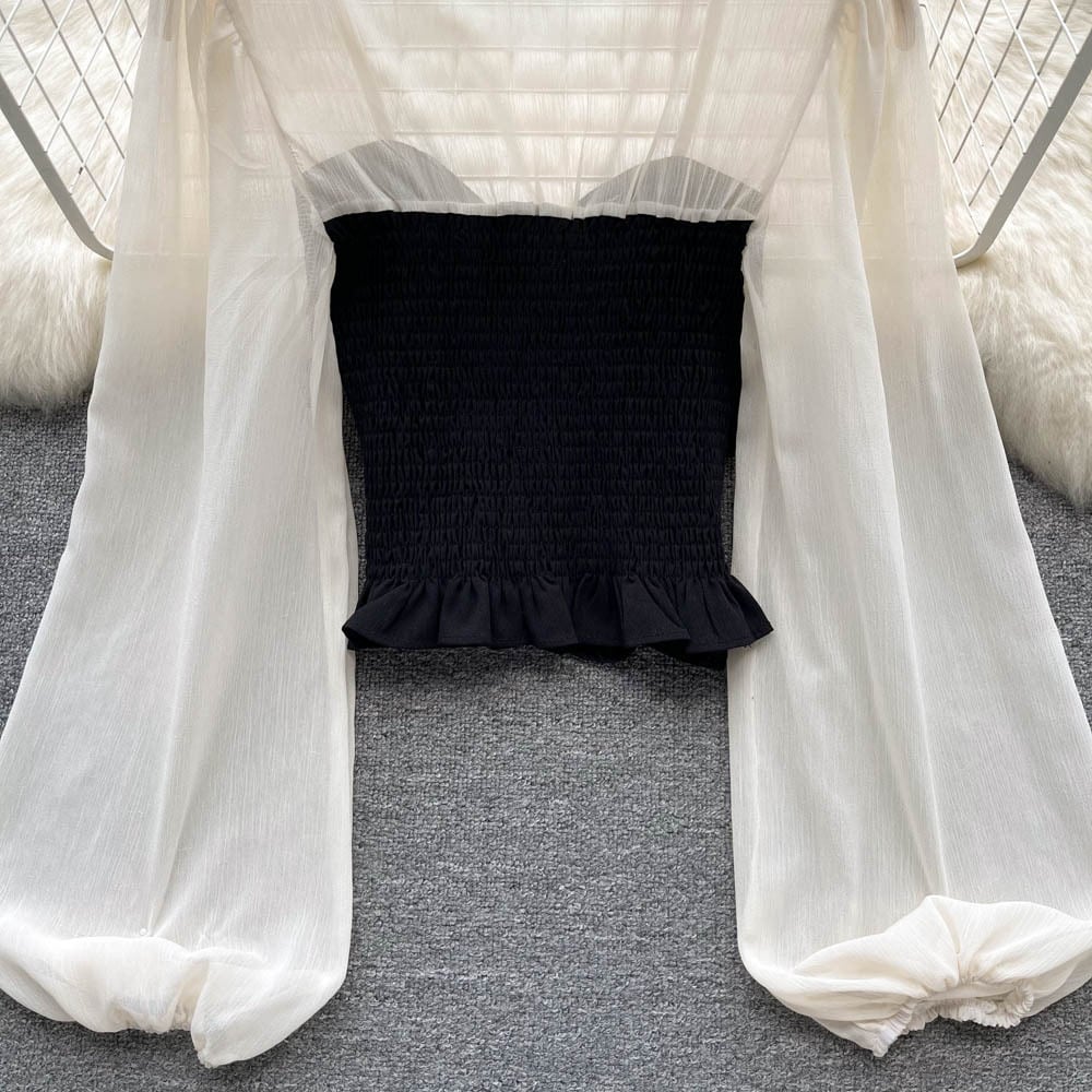 フレンチデザインセンスニッチカラーコントラスト長袖シャツトップ初秋レディースショートスクエアネックシャツ洋風綺麗小シャツ ロング オータム 秋物 スクウェア lyxaj33101317105