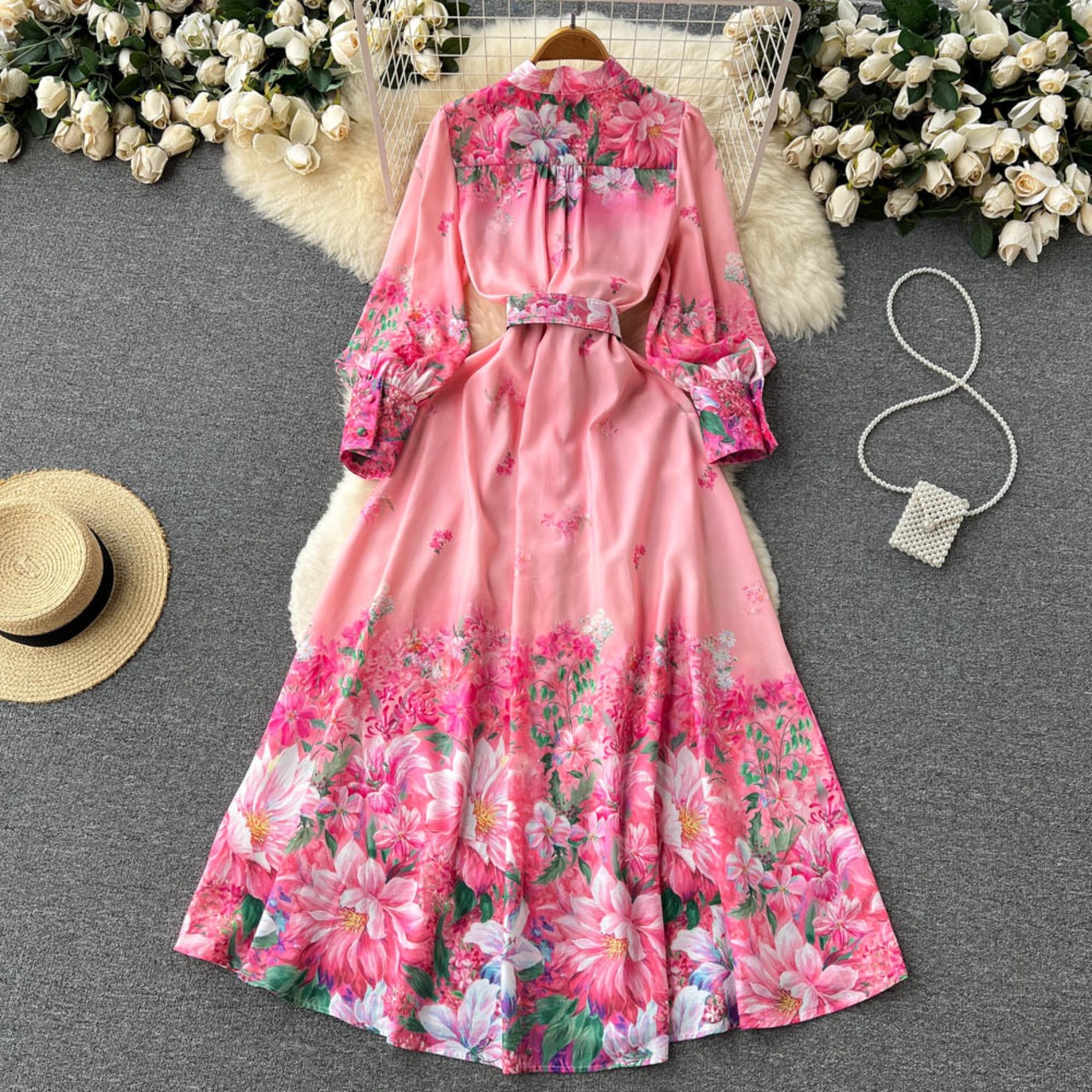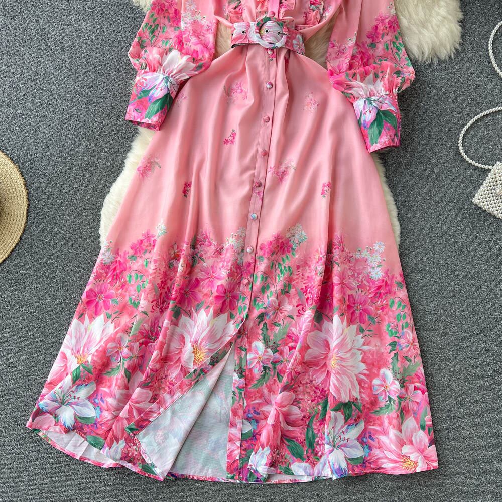 Ethnic style waist slimming long-sleeved printed dress summer women's high-end temperament stunning shirt long skirt ロング プリント サマー 夏物 スカート lyxaj4219408049