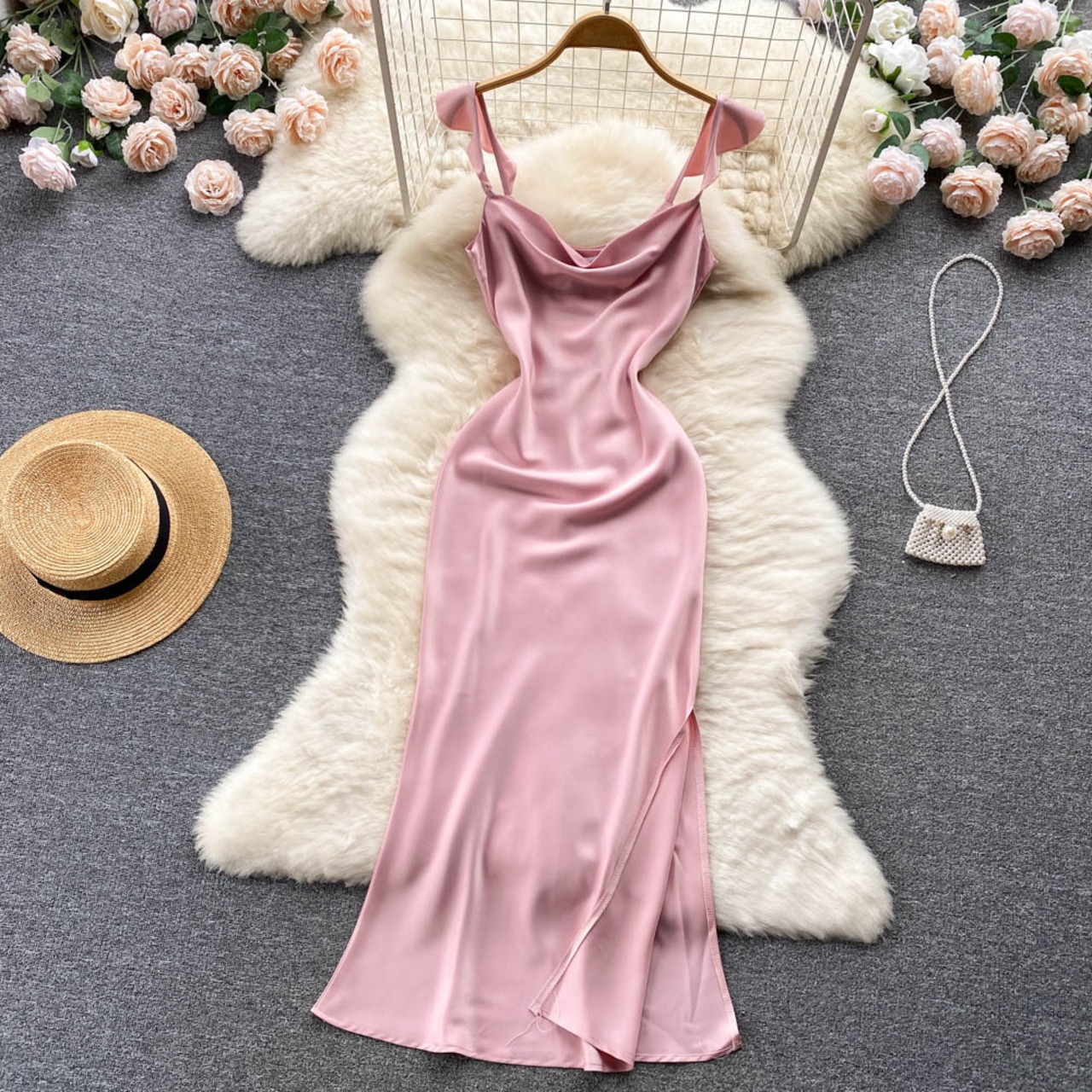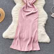 2022 夏新作サテン優しいフレンチドレスフェミニンなスリングデザイン小さなスプリットロングスカート サマー 夏物 lyxaj99949157006