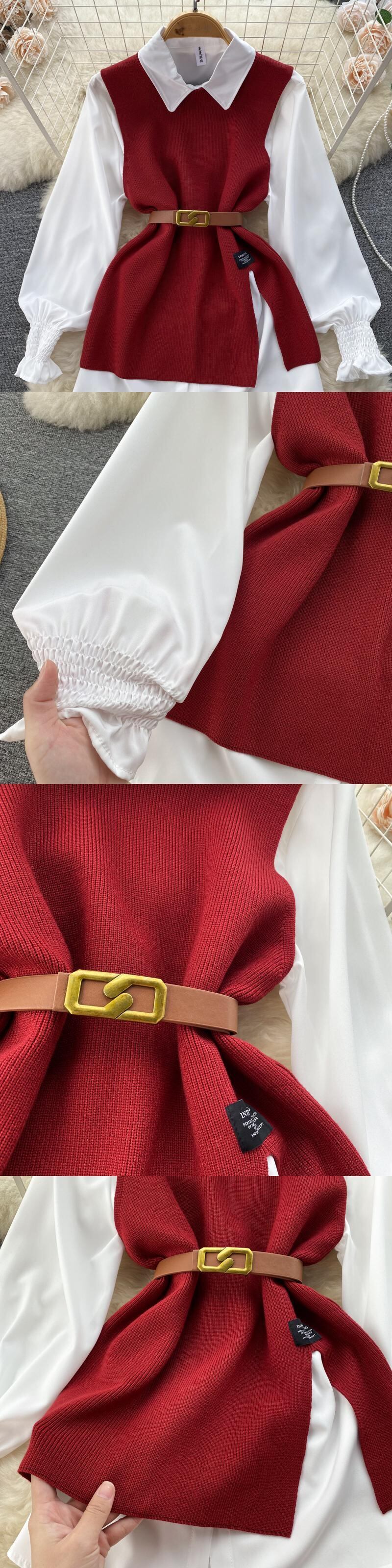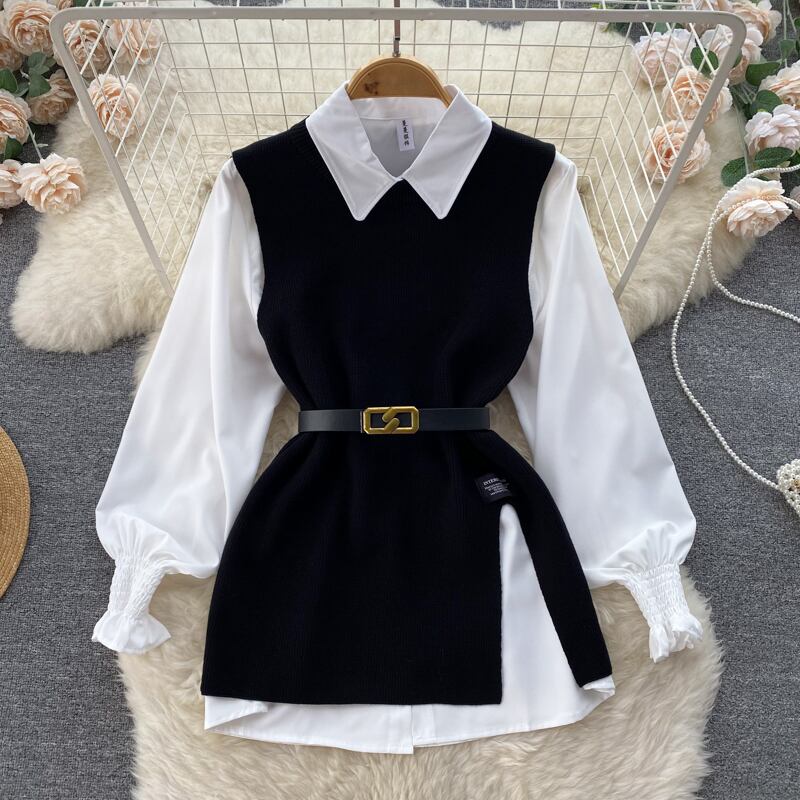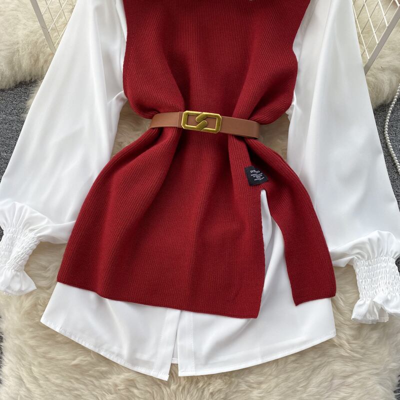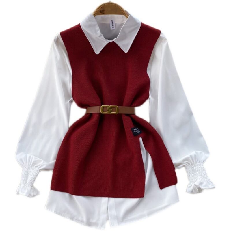 ツーピーススーツの女性の秋の活気と年齢を減らすゆるいニットベストベスト長袖白シャツトップ ロング ホワイト オータム 秋物 lyxaj77756999434