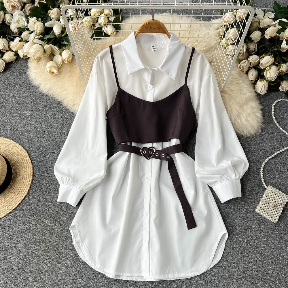 高品質の小さなキャミソール ツーピース ポロ カラー ドレス秋の女性小さな長袖白シャツ スカート ロング ホワイト オータム 秋物 lyxaj80287276581