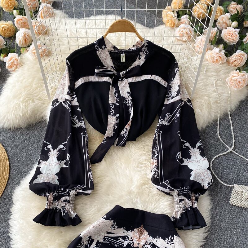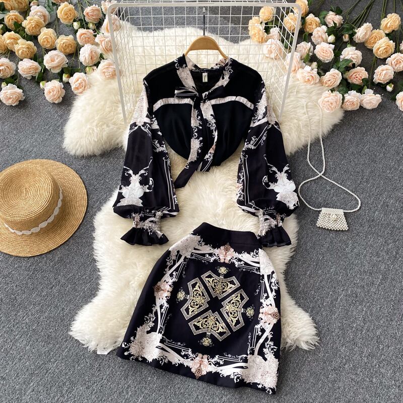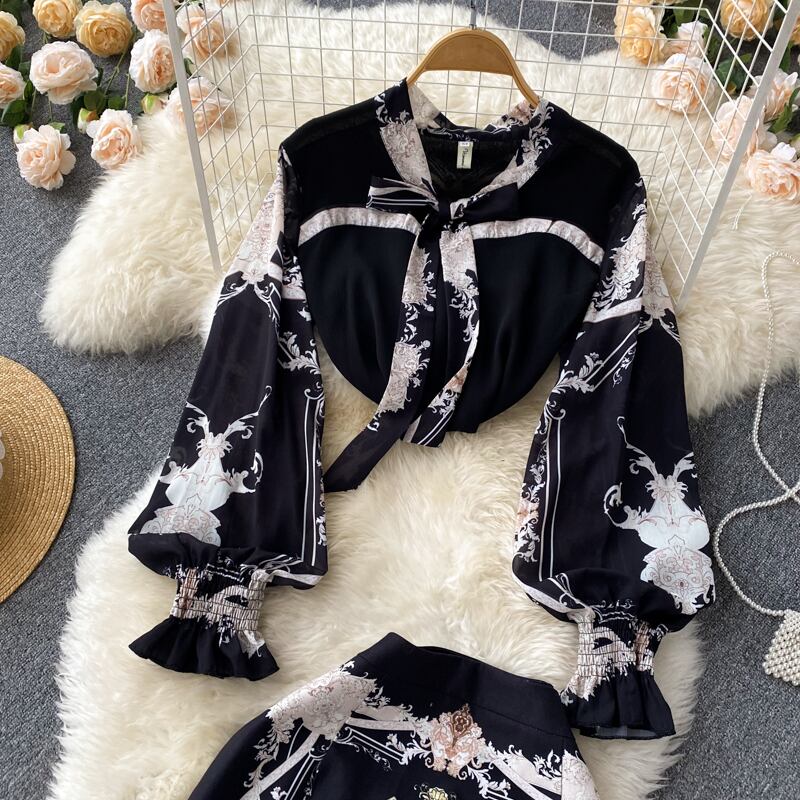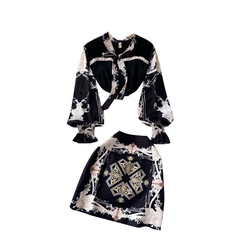 有名人の気質プリント長袖蝶ネクタイシャツ女性のハイウエストバッグヒップスカートスリムファッションスーツスカート ハイウェスト ロング リボン lyxaj84846809676