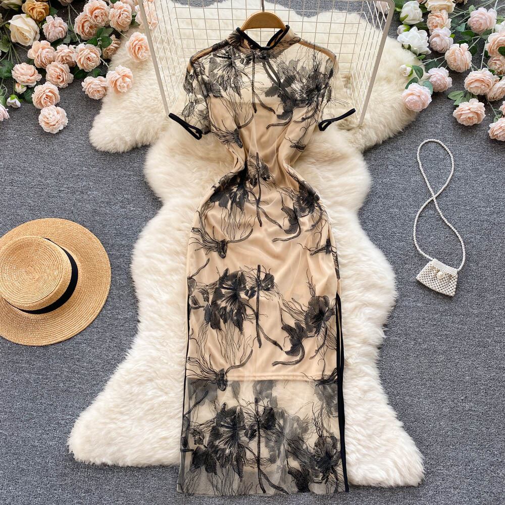 軽やかなお馴染みスタイル メッシュステッチ 半袖 チャイナドレス 夏 レディース シック 綺麗め バッグ ヒップ ミドル丈 スカート 潮 サマー 夏物 lyxaj19370859431