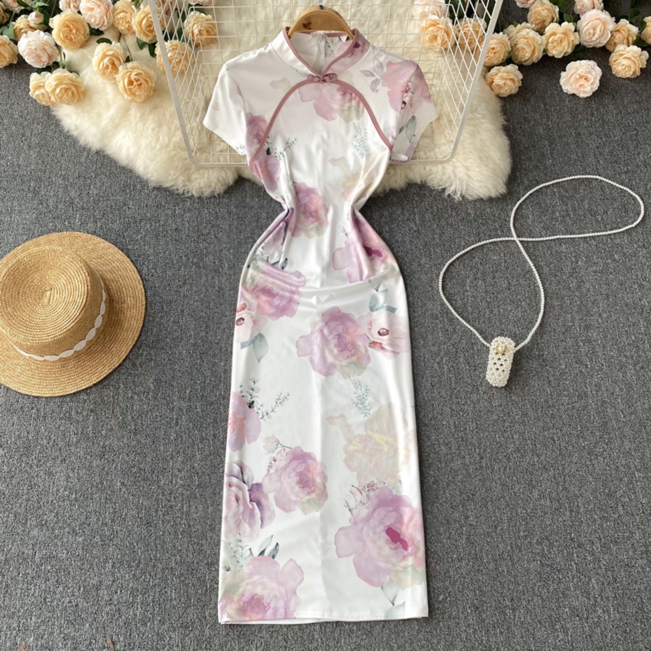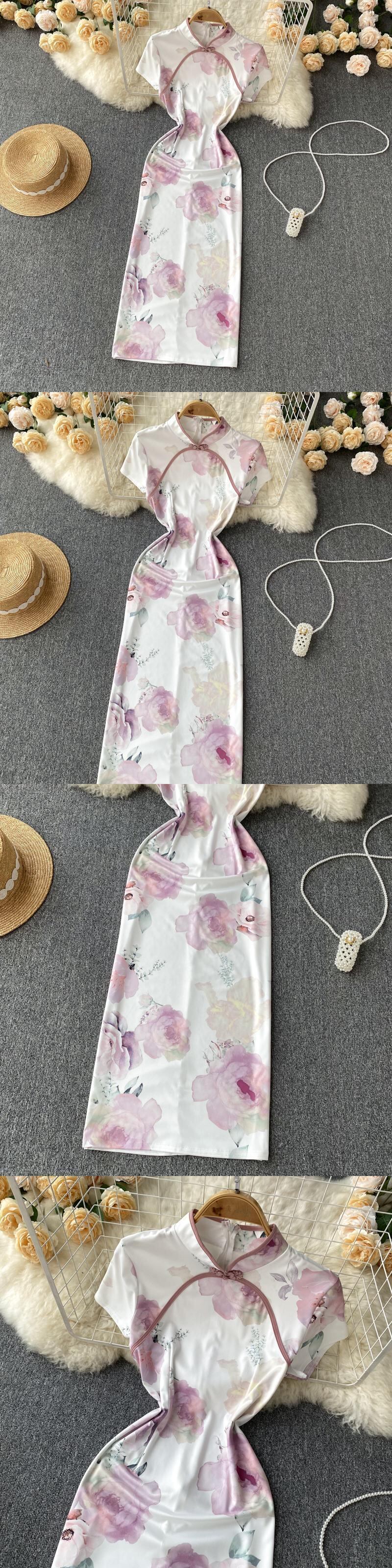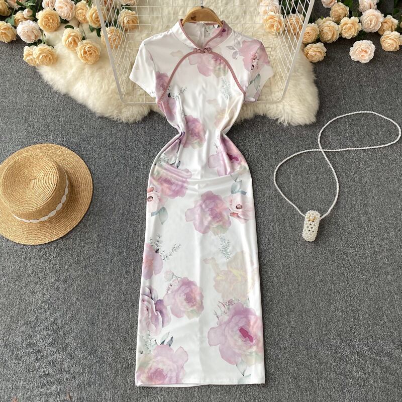 改善されたチャイナ ドレス ガール バージョン スタンド カラー花柄半袖ドレス女性の夏のスリム フィットとスリムな気質バッグ ヒップ ミディ スカート サマー 夏物 lyxaj72898670839