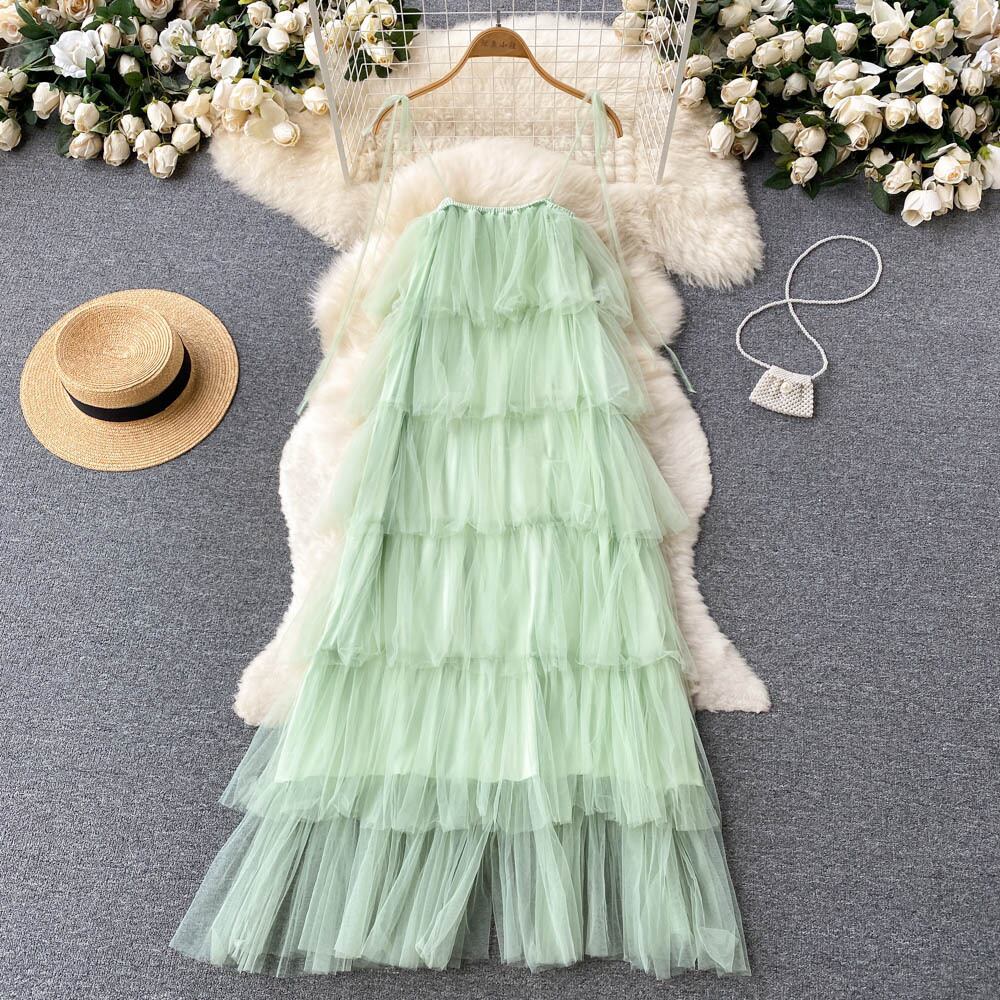 小さな新鮮な緑のドレス夏の女性の甘いメッシュ多層蓮の葉のケーキのスカート年齢を減らす休日のサスペンダー スカート 大人ガーリー スウィート キュート カジュアル サマー 夏物 グリーン lyxaj77962071321