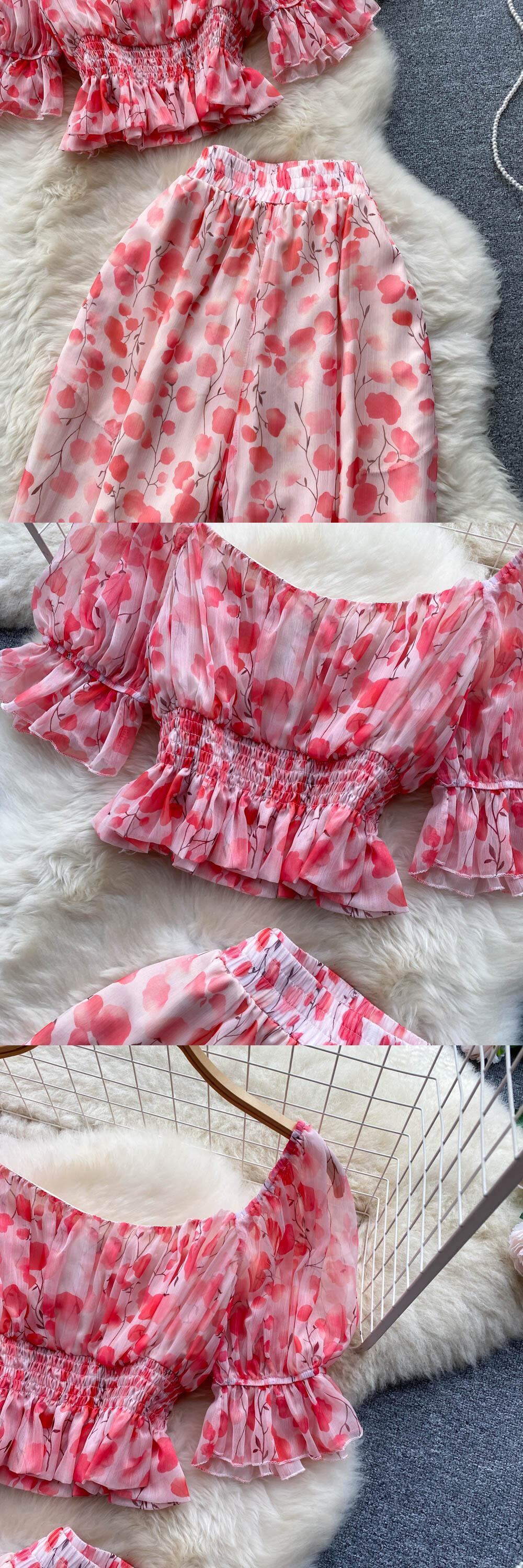 花柄シフォンシャツフェミニンスクエアネックスリムショートパフスリーブトップハイウエストワイドレッグパンツ夏ツーピーススーツ サマー 夏物 ワイドパンツ スクウェア lyxaj18936357520