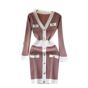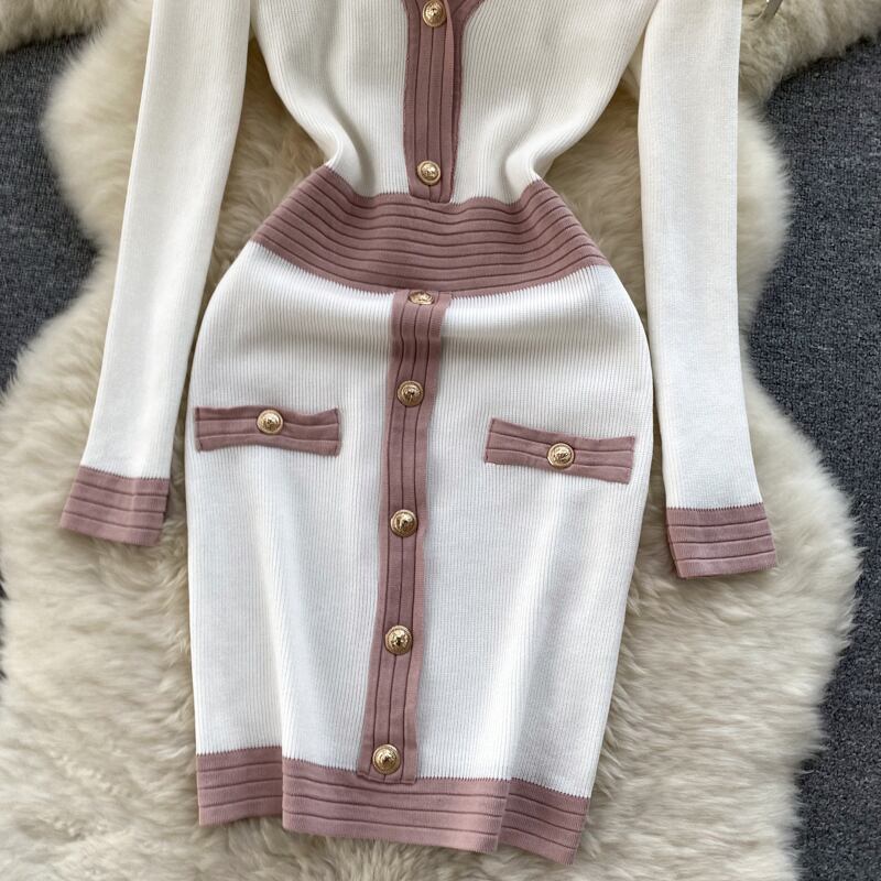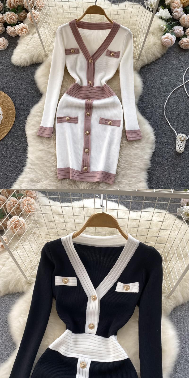 軽くおなじみのスタイルの対照的な色気質 V ネック ドレス夏の女性のシックな見事なニット スリム長袖ミディ スカート ロング サマー 夏物 Vネック lyxaj18211346327
