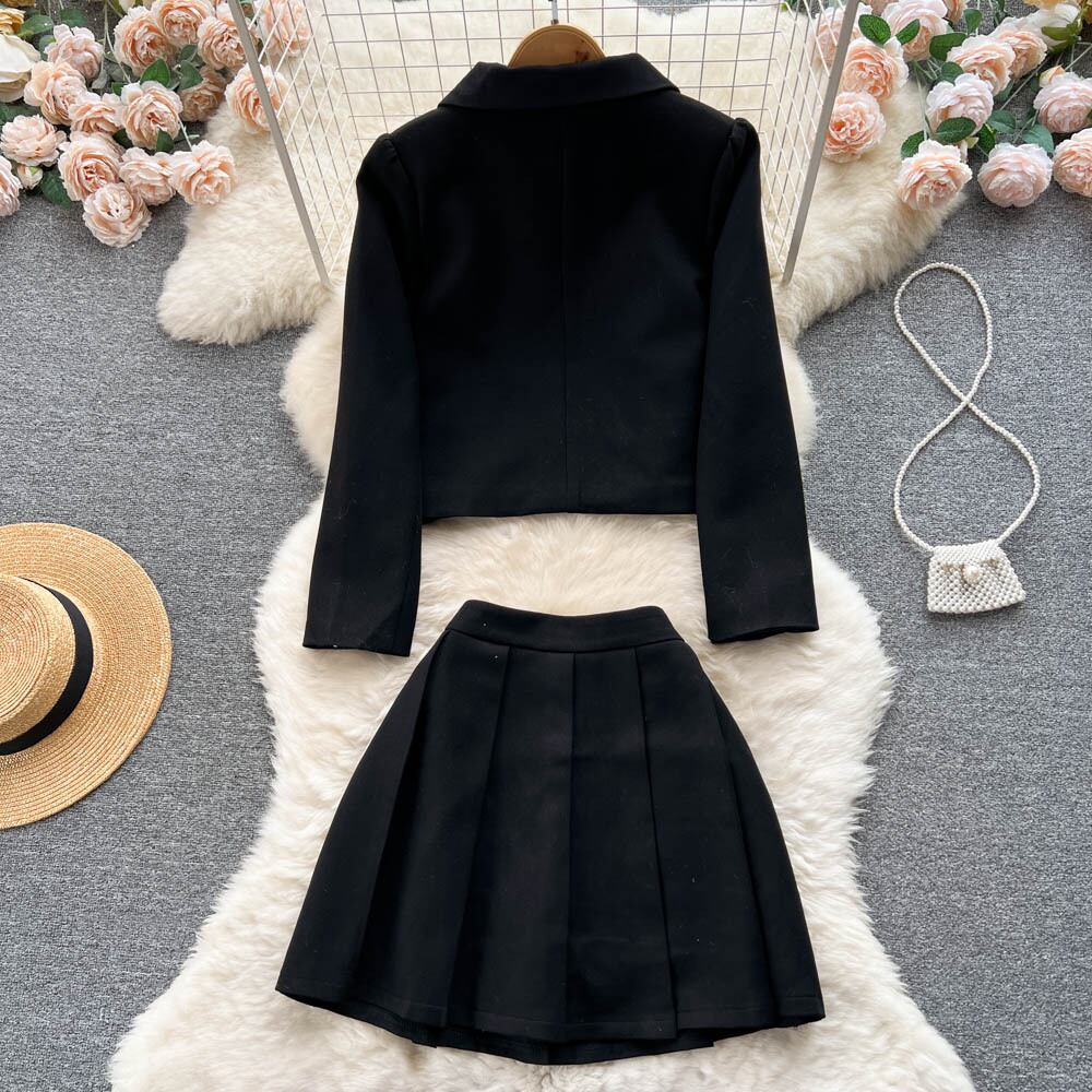 高品質のツーピース スーツ女性秋日本カレッジ スタイル ショート スーツ ジャケット ハイウエスト プリーツ ハーフ丈 スカート ハイウェスト オータム 秋物 lyxaj82539355310