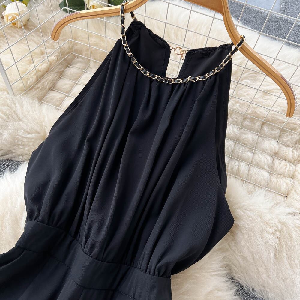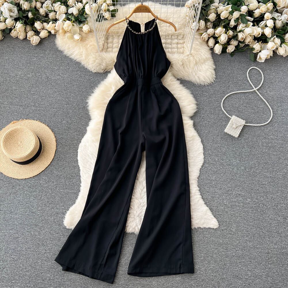 デザインセンス チェーン 小さめフレグランス 吊り下げネック ジャンプスーツ レディース 夏新作 ドレープ ハイウエスト ブラック ワイドレッグ ロングパンツ トレンド ハイウェスト サマー 夏物 lyxaj78467052104