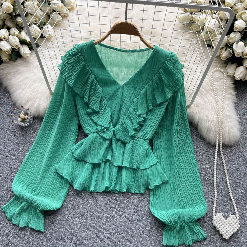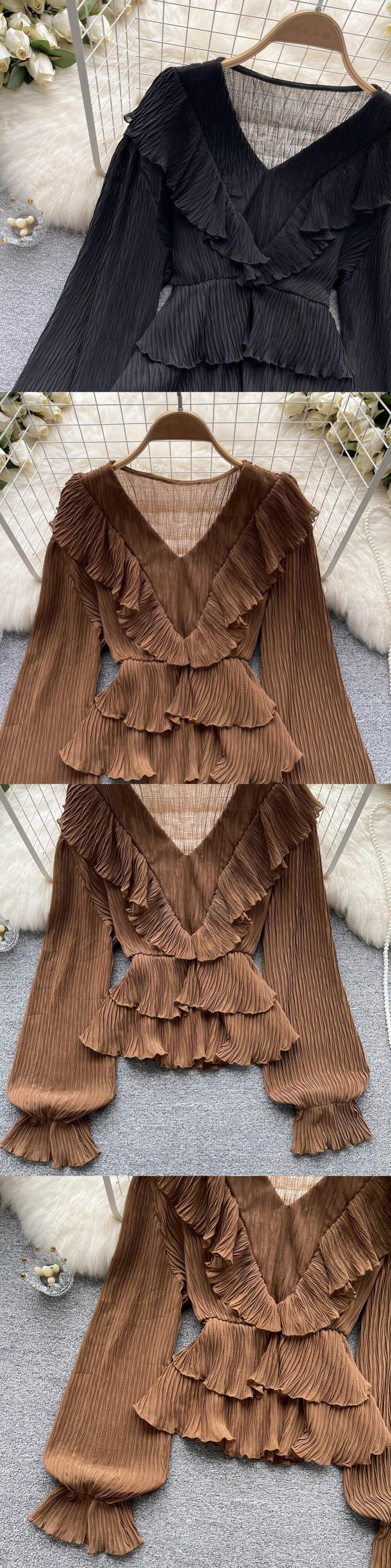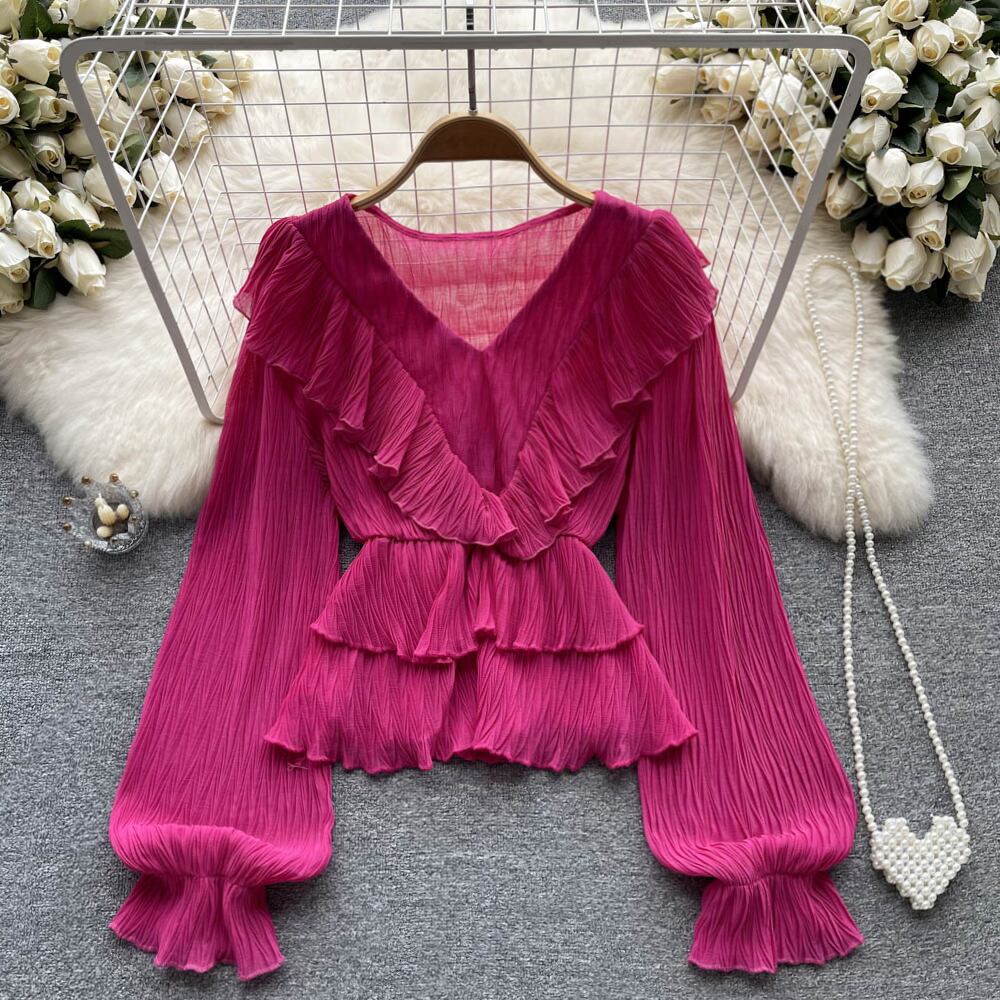 デザインセンスニッチフリルVネックウエストベルスリーブシャツトップ秋レディースフレンチショート白シャツ ホワイト オータム 秋物 lyxaj83823277487