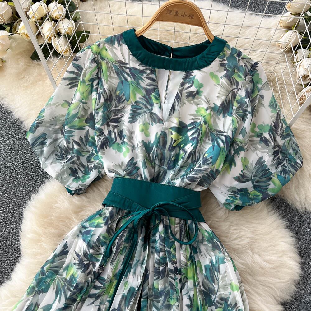 夏の小さな新鮮な花柄のドレス、通気性のあるシフォンのエレガントなネクタイ、半袖のプリーツ、フリル付きのミドル丈のスカート サマー 夏物 lyxaj23133173529