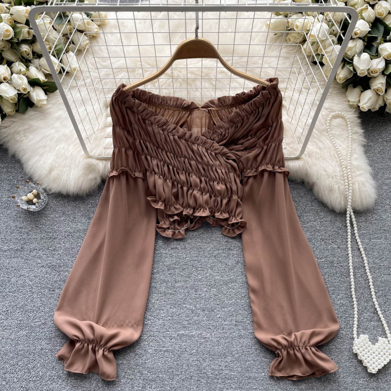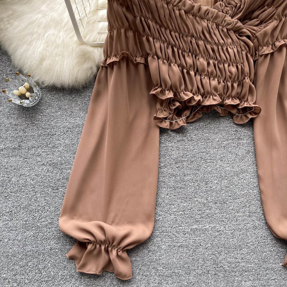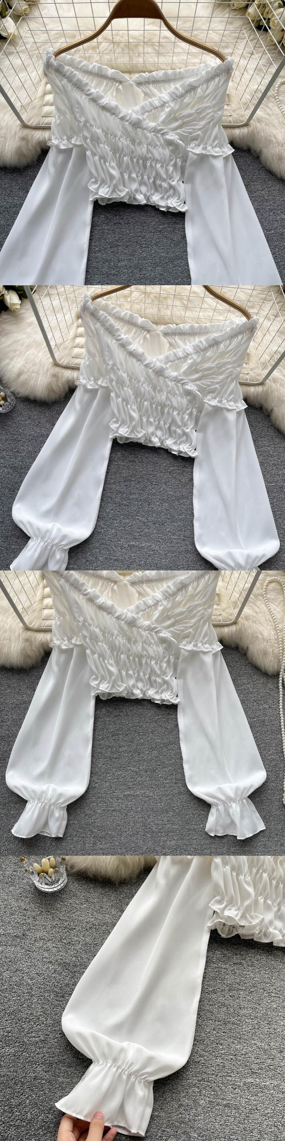 Pure desire style design pleated one-shoulder shirt top autumn women's French retro short long-sleeved white shirt ショート ロング ホワイト レトロ プリーツ オータム 秋物 lyxaj13630781152