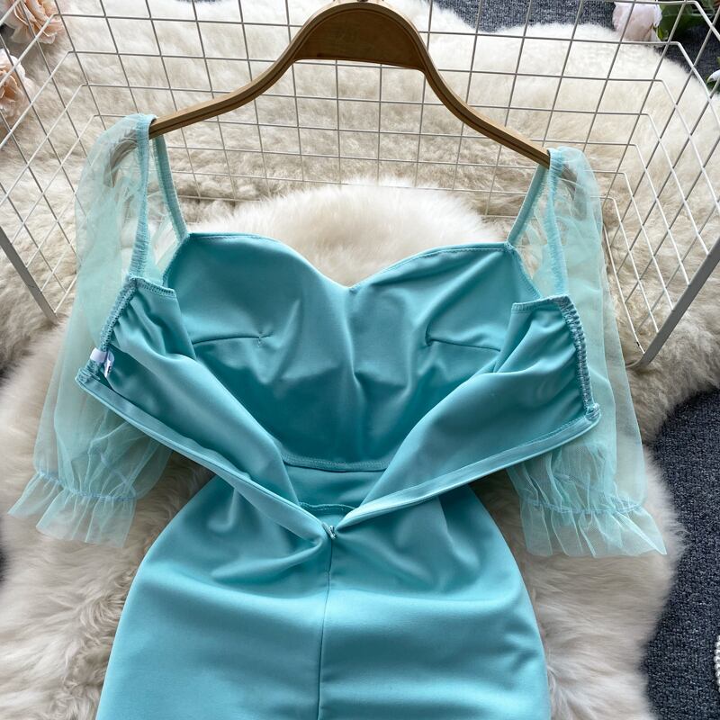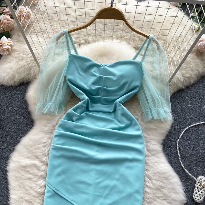 Super fairy Sen first love y sexy clavicle mesh puff sleeve dress female slim bag hip temperament short skirt ショート メッシュ スカート スリム lyxaj59899972025