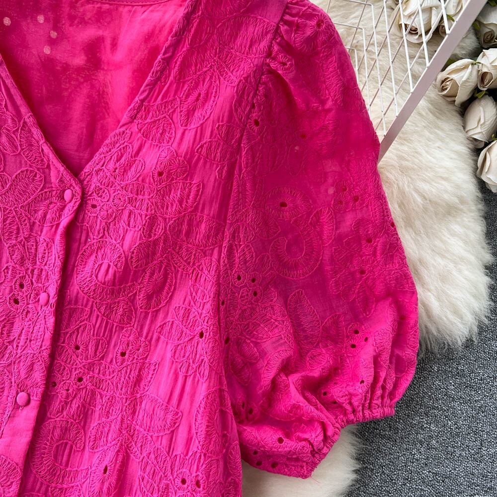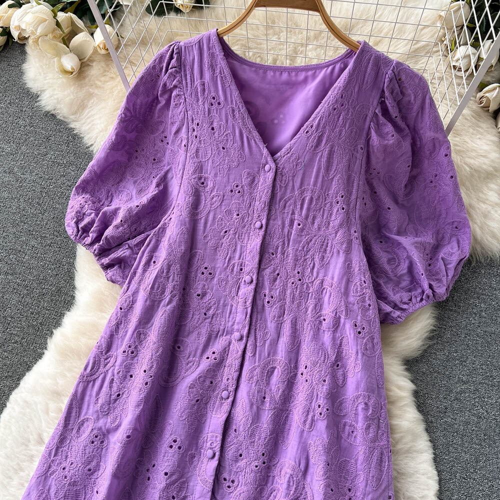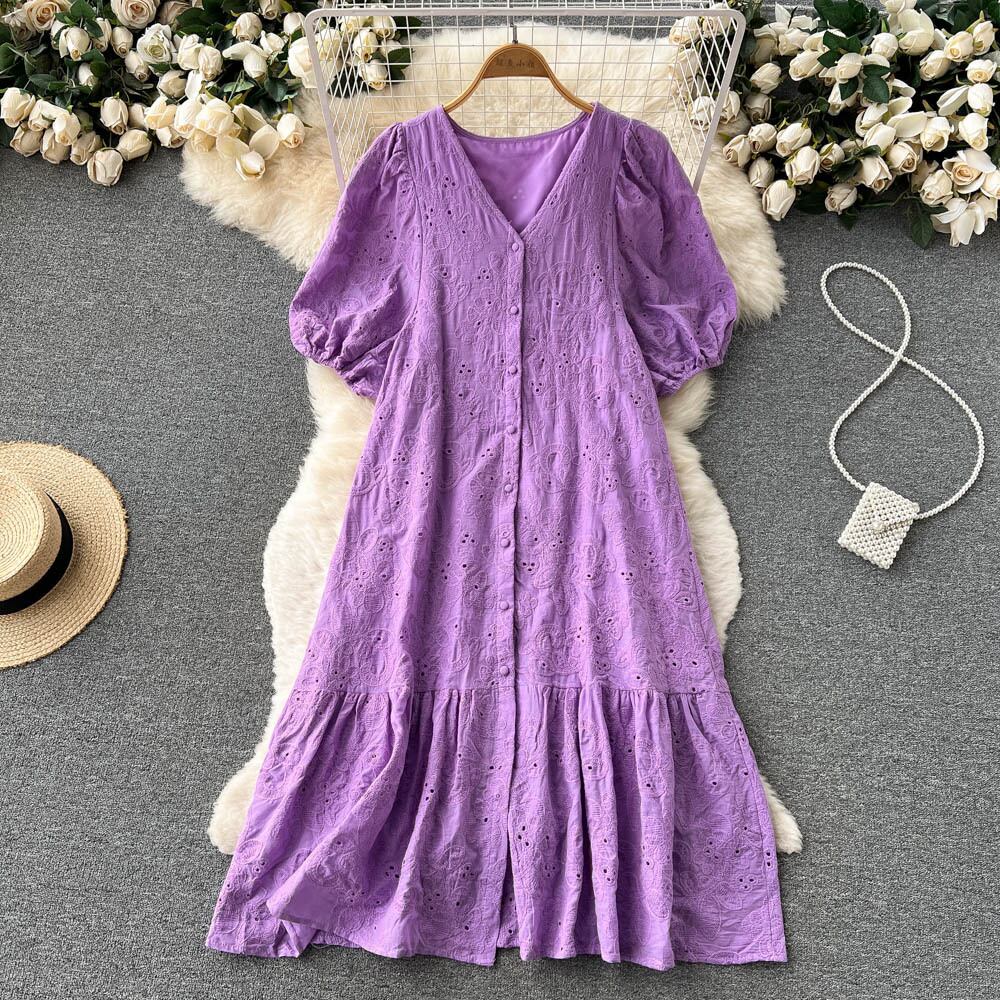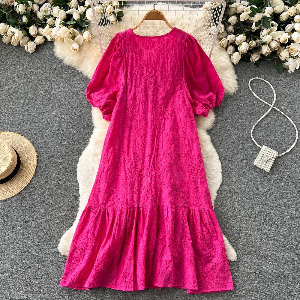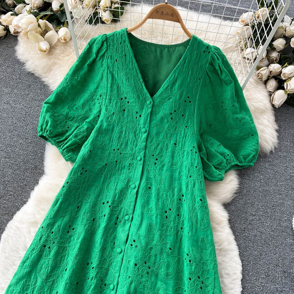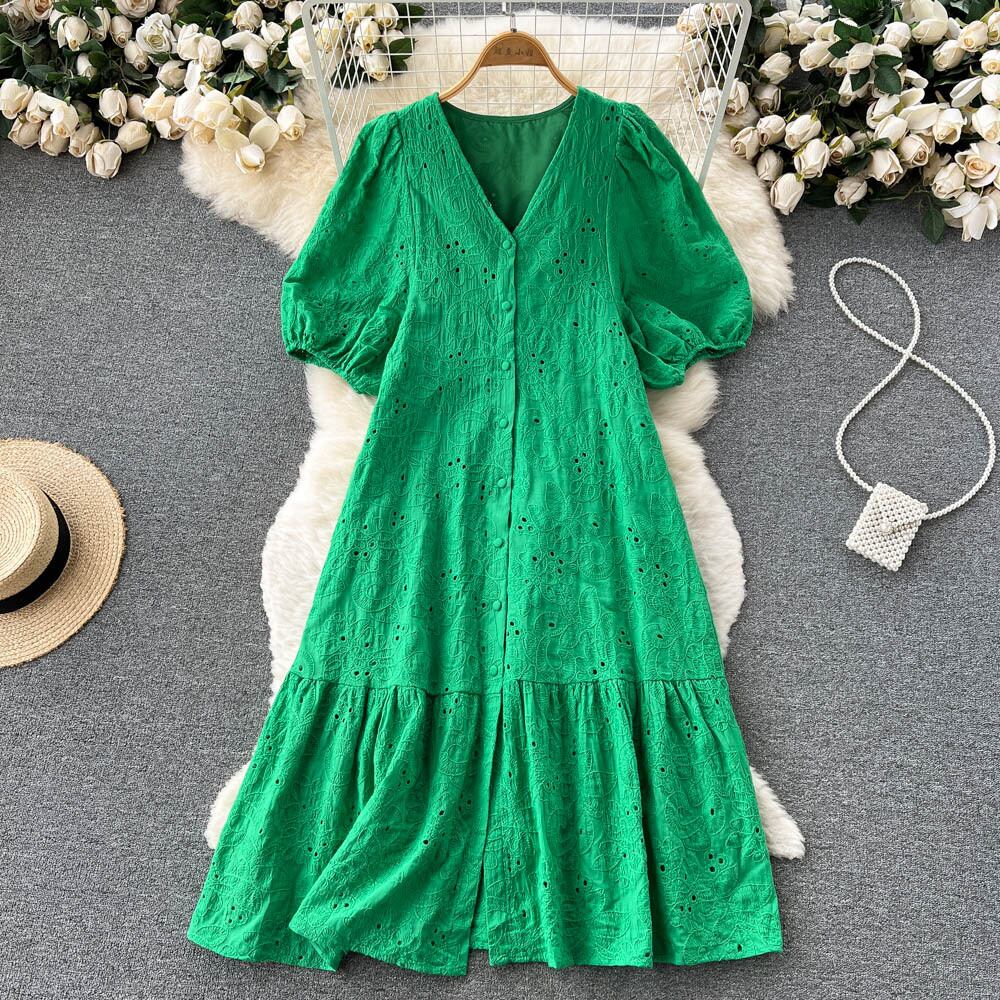 高品質の寒風中空パフ スリーブ ドレス夏の女性のフレンチ スタイルのゆったりとした薄い気質 V ネック ロング スカート サマー 夏物 Vネック lyxaj17803407480