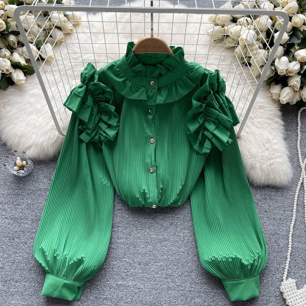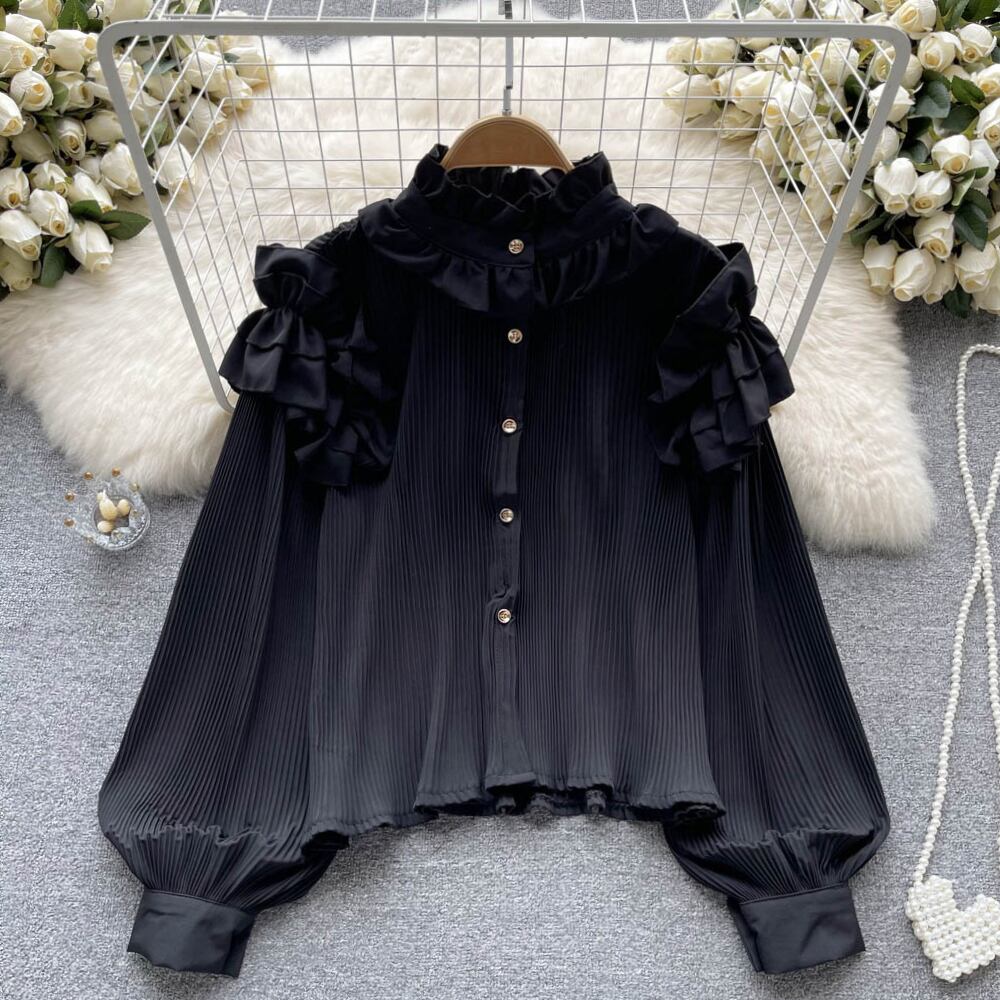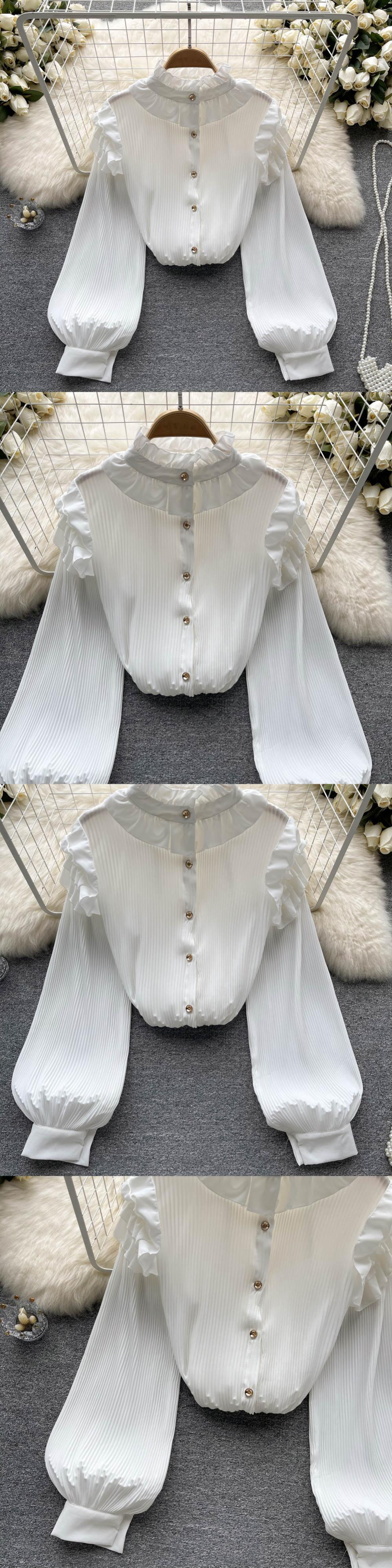 フレンチデザインセンスニッチハスリーフランタンスリーブシャツトップ秋レディースニットステッチ洋風白シャツ ホワイト オータム 秋物 lyxaj16966921770