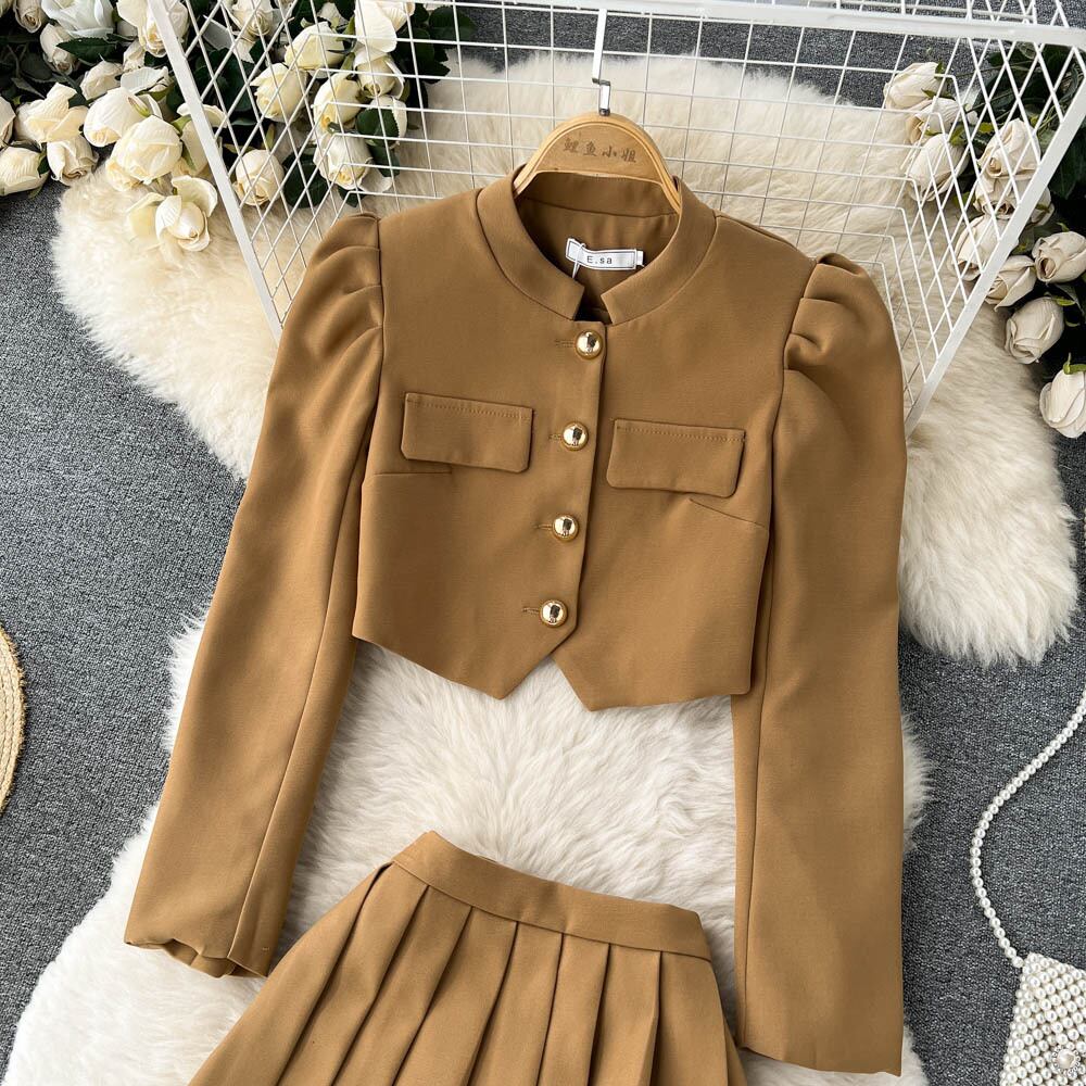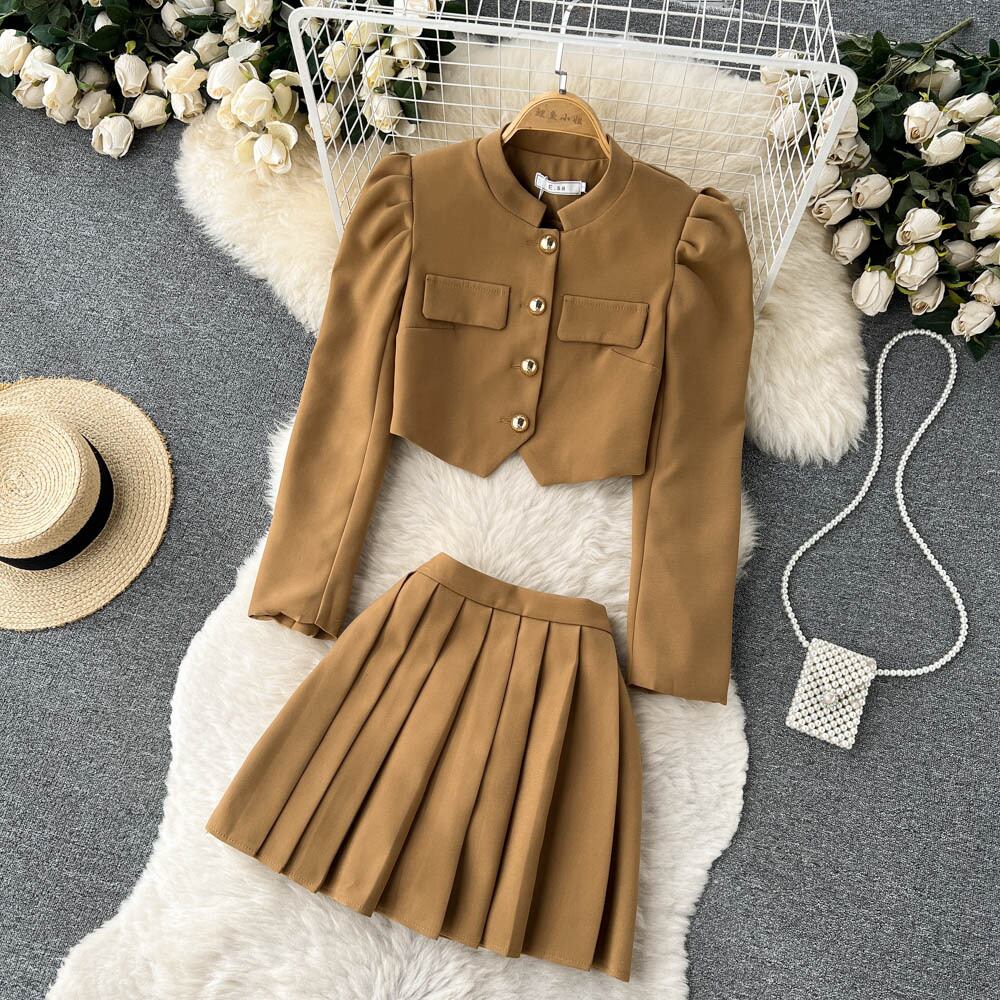 日本の大学スタイルのツーピース スーツ女性秋気質有名人長袖ショート コート ハイ ウエスト プリーツ スカート ハイウェスト ロング オータム 秋物 lyxaj13816298801