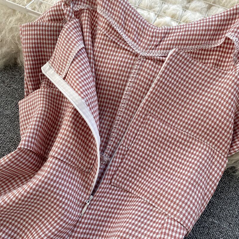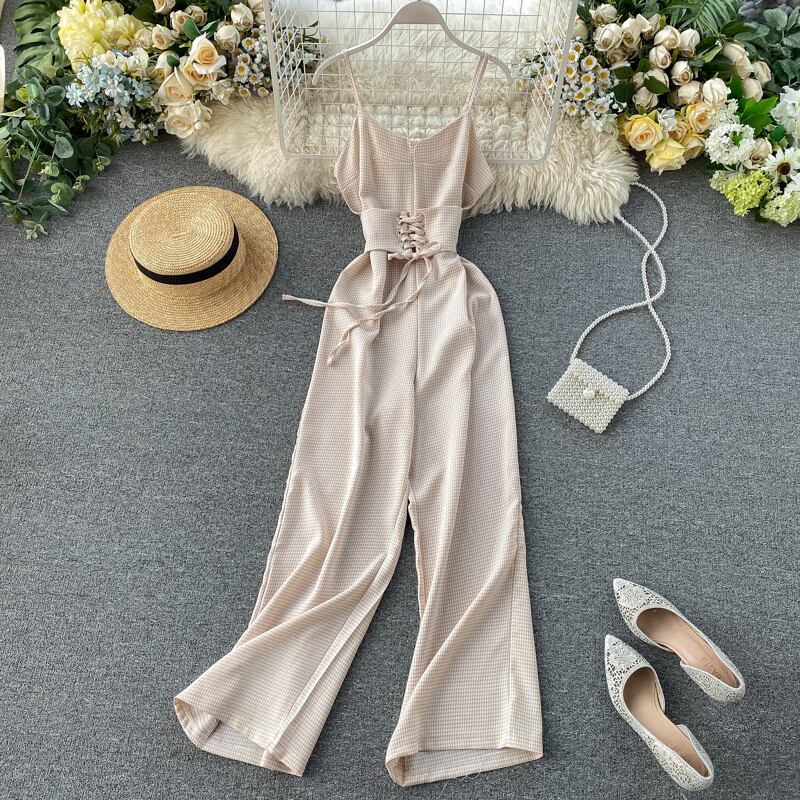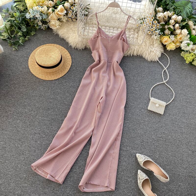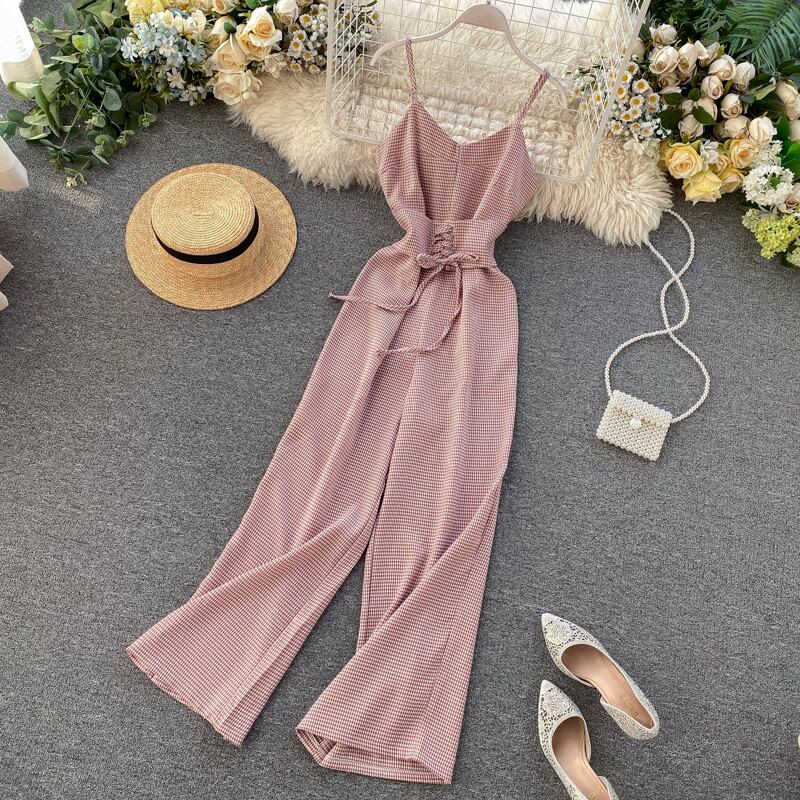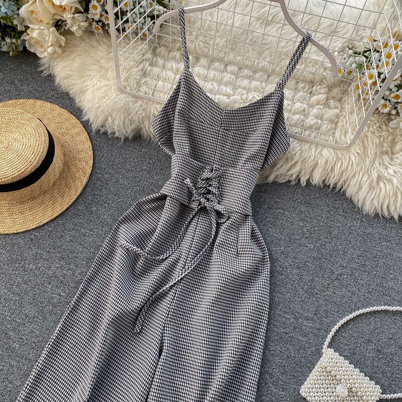 ヨーロッパとアメリカのスタイル 2020 春の新しいレトロなファッションチェック柄 V ネック背中の開いたウエストタイショー薄いワイドレッグジャンプスーツ スプリング 春物 Vネック ヨーロピアン lyxaj60080451378