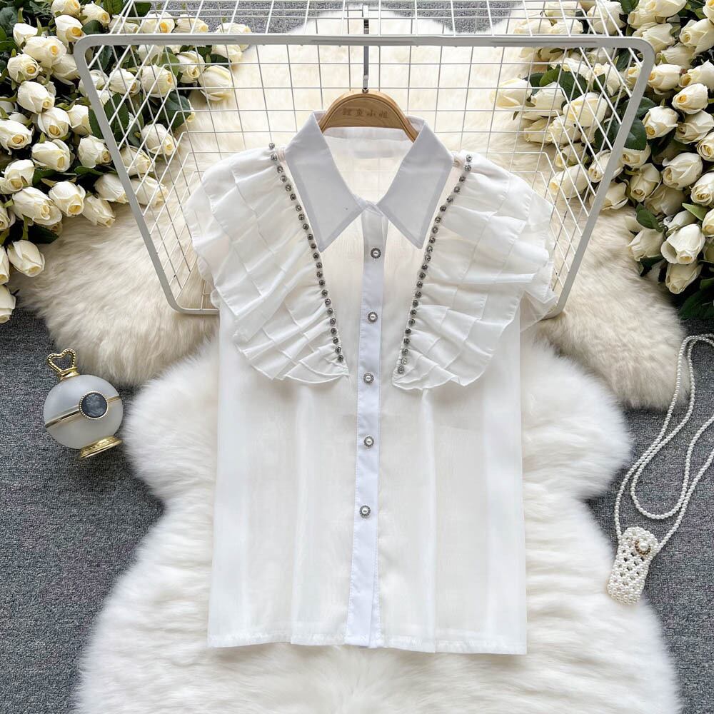 シックなデザインセンスのステッチフリルラペルシングルブレストノースリーブシャツ女性の夏の薄い緩い気質トップ サマー 夏物 lyxaj59095505711