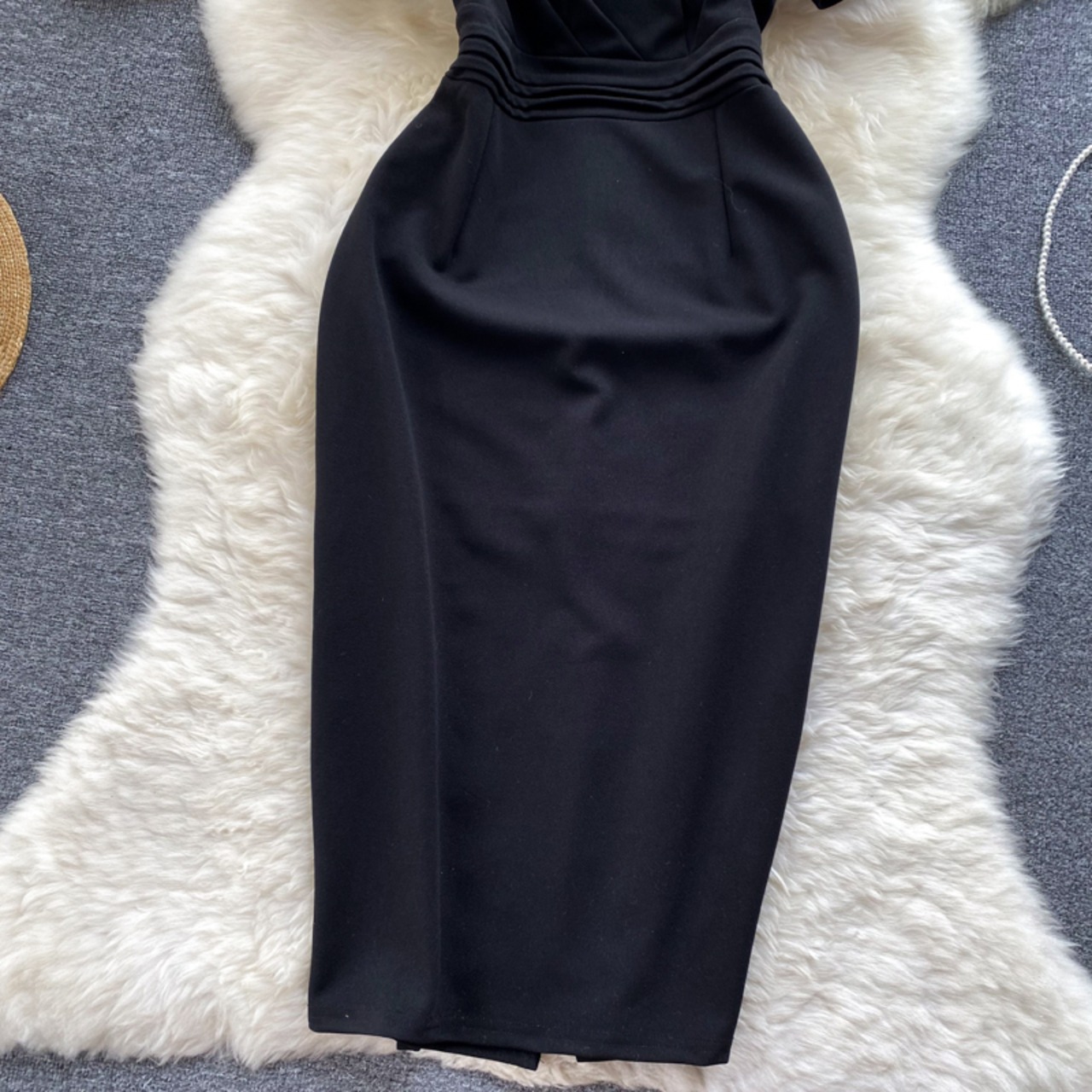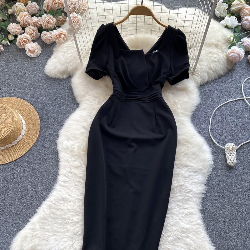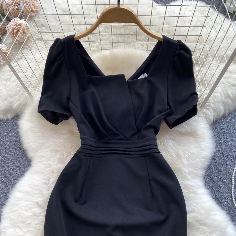 ハイエンドフレンチ気質スクエアネックドレス夏の女性のヘップバーンスタイルのウエスト甘くてスパイシーなバッグヒップリトルブラックドレス 大人ガーリー スウィート キュート カジュアル サマー 夏物 スクウェア lyxaj1024613906
