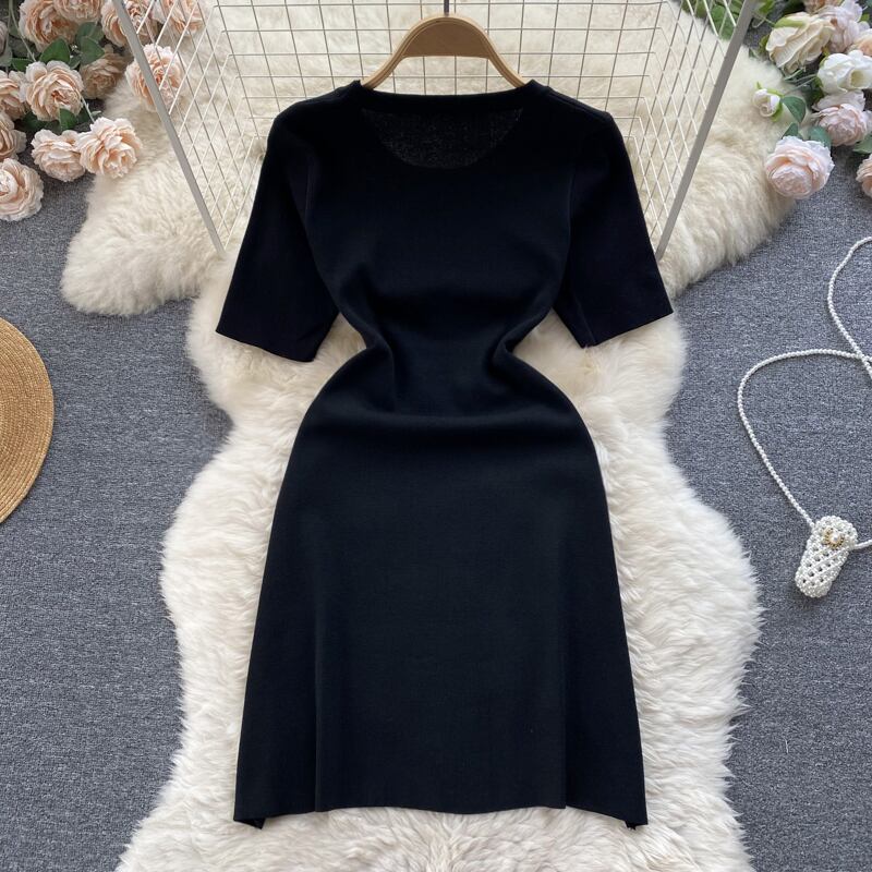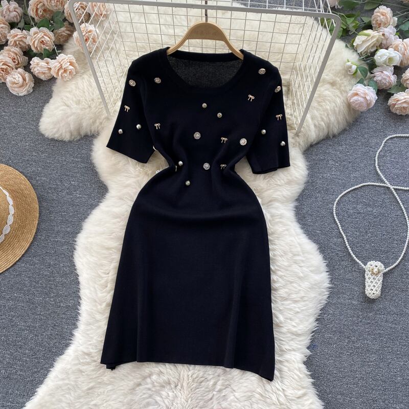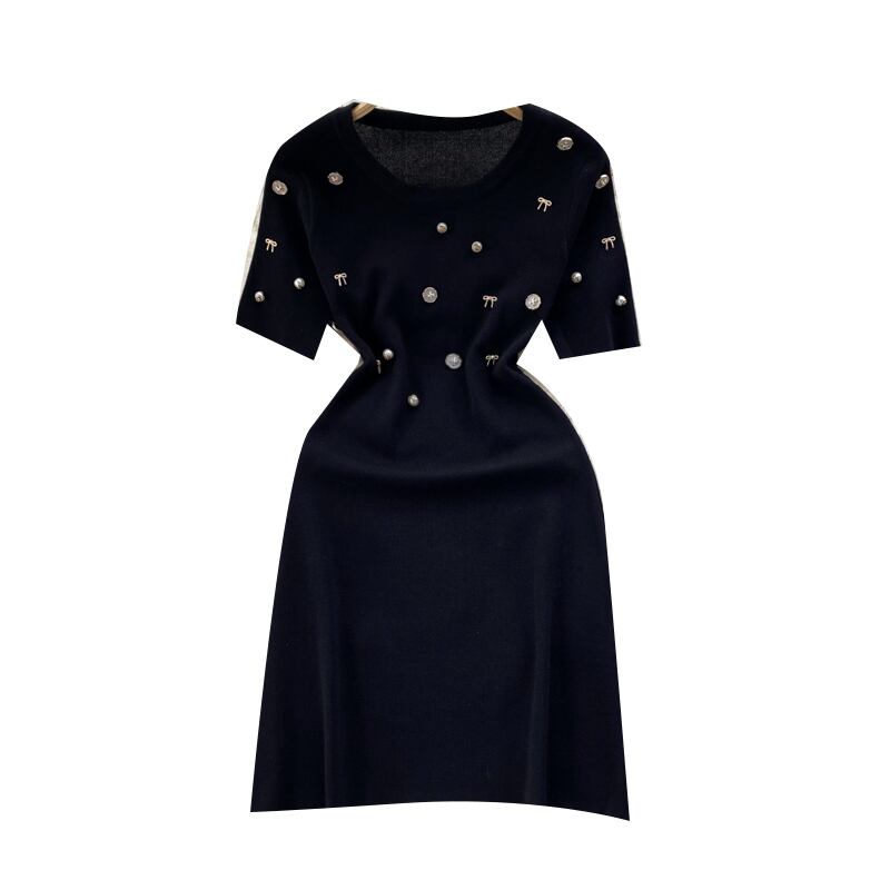 ハイエンドのニッチなデザインのビーズのラウンド ネック ドレス夏の女性のフレンチ ウエスト美しい A ライン リトル ブラック ドレス サマー 夏物 Oネック Aライン lyxaj27056617345