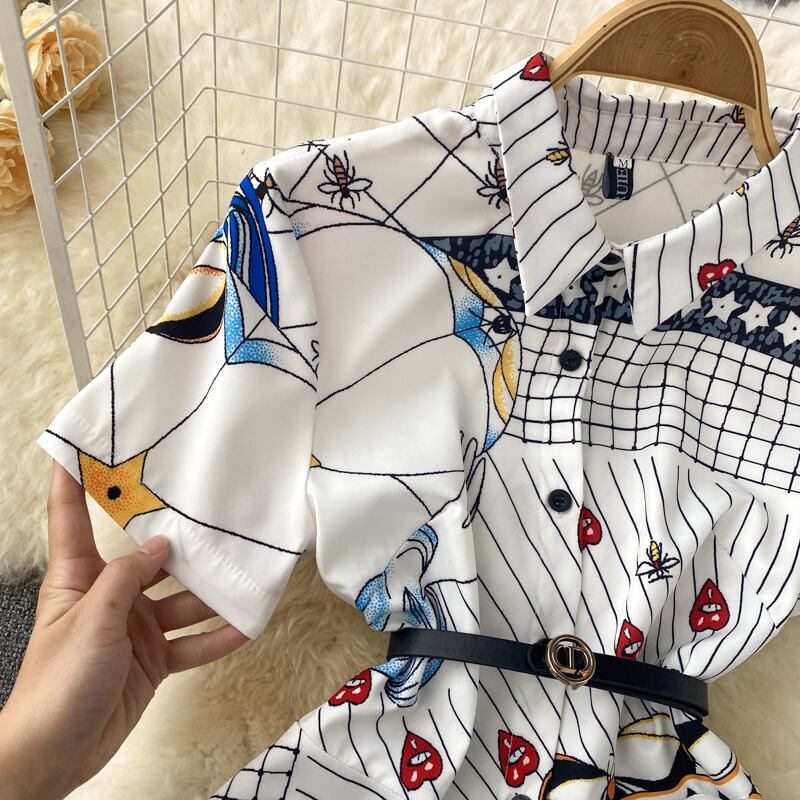 2022年夏の新星と同じプリントのエレガントな気質の大きなシングルブレストのポロカラーウエストドレス サマー 夏物 lyxaj60055185728