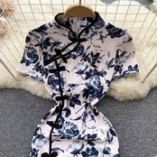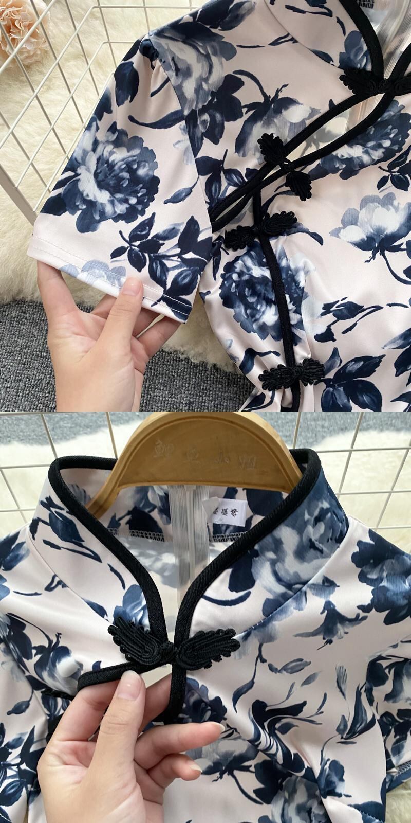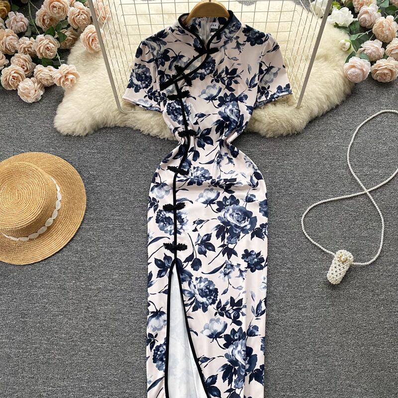 高品質のレトロな改良されたチャイナ ドレス プリント ドレス夏の女性の軽い成熟した風ウエスト ディスク バックル分割バッグ ヒップ スカート サマー 夏物 lyxaj87507781955