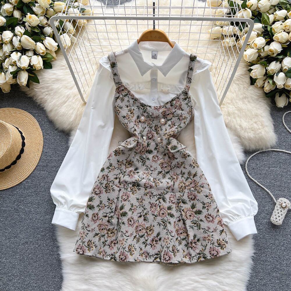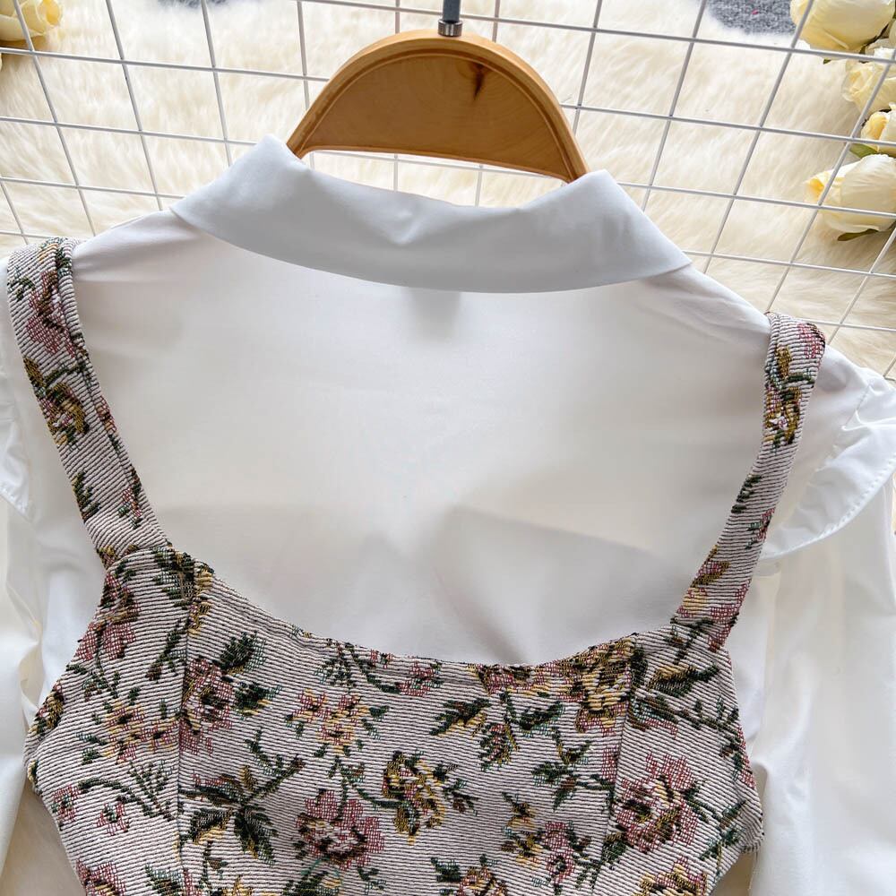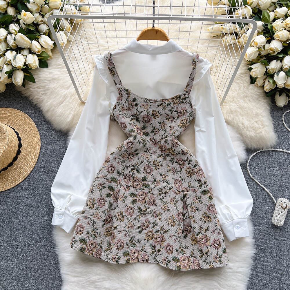 冷たい風のハイエンド花柄サスペンダー ドレス夏の女性のスーツ白長袖気質シャツ トップ潮 ロング ホワイト サマー 夏物 lyxaj58552160063