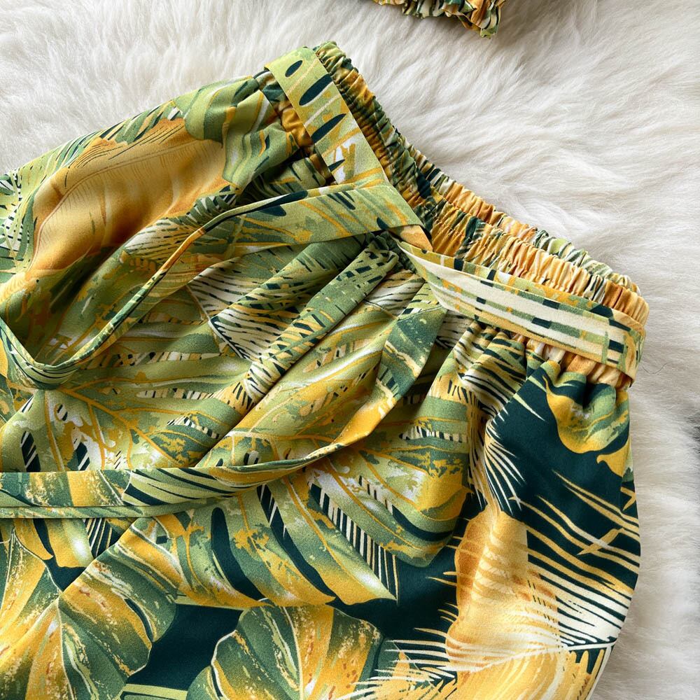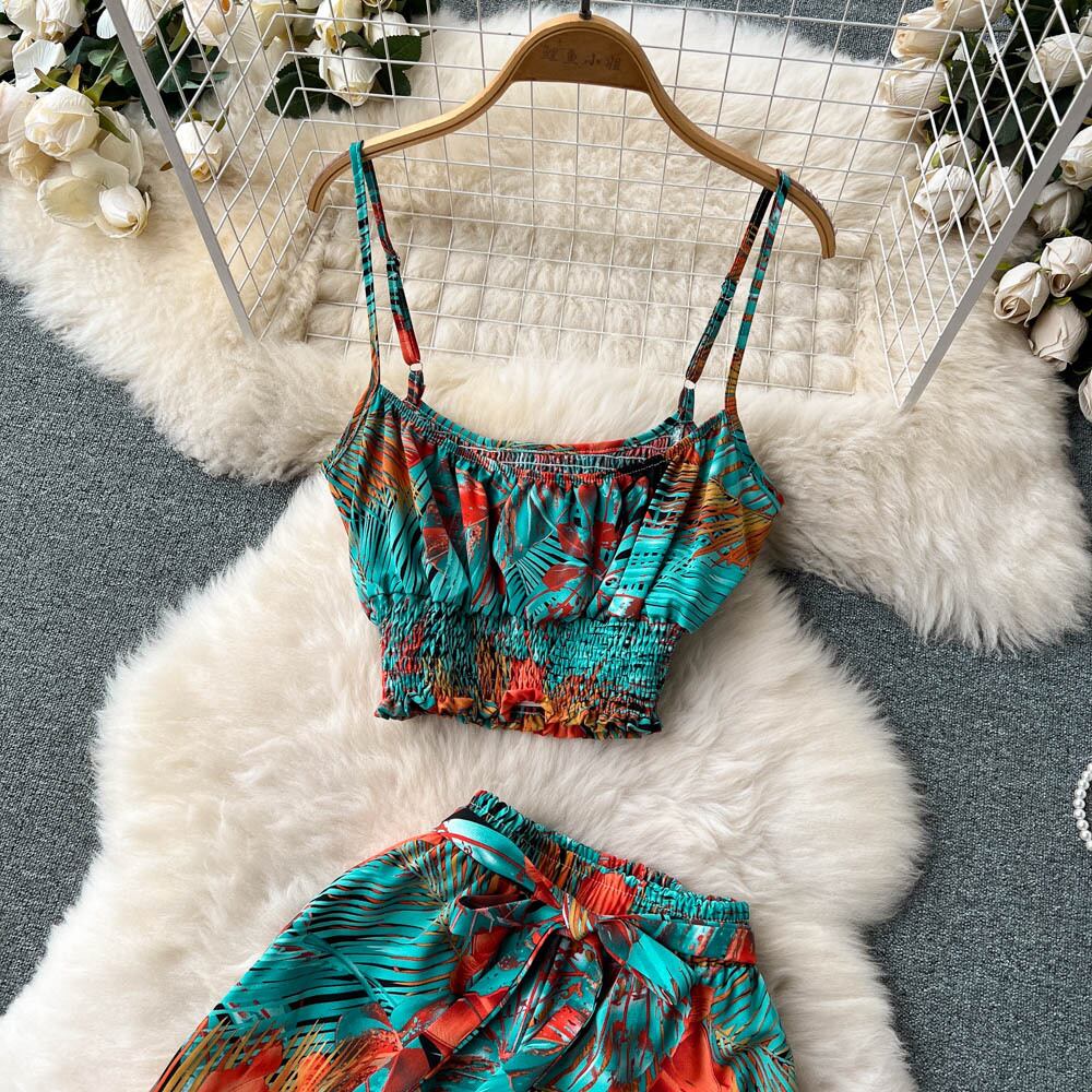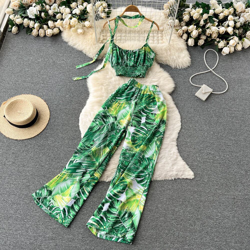 ビーチシーサイドホリデースーツレディースファッションプリントキャミソールアウターウェアハイウエストワイドレッグパンツカジュアルツーピースセット ハイウェスト ワイドパンツ lyxaj83209196925