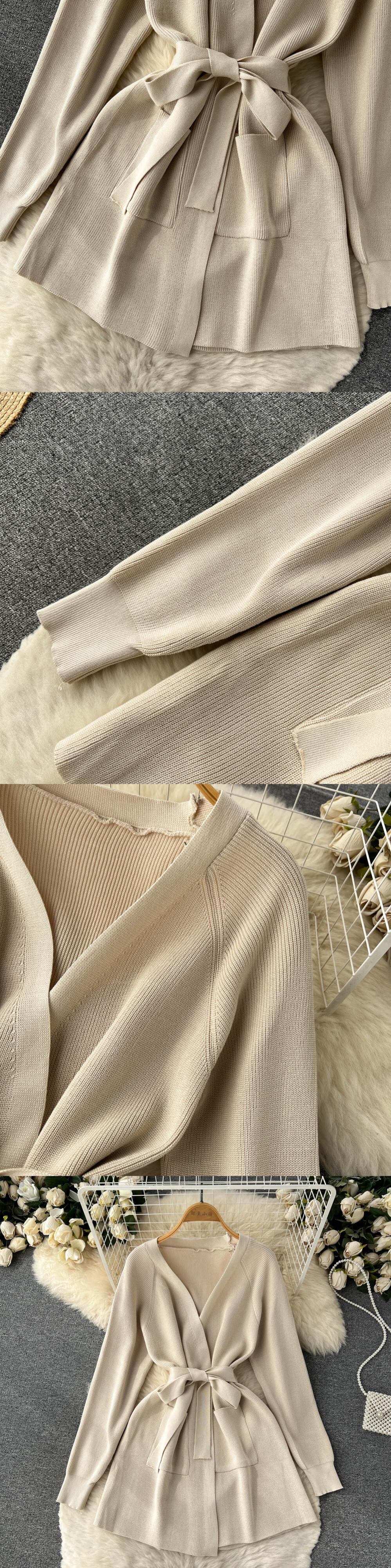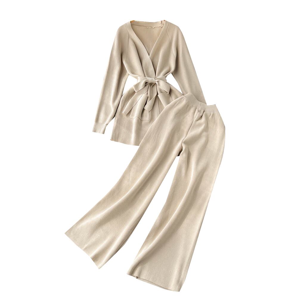秋のツーピーススーツのニッチなデザインのレースアップウエスト長袖ニットカーディガンコートハイウエストルーズワイドレッグパンツ ハイウェスト ロング オータム 秋物 ワイドパンツ lyxaj6165855102