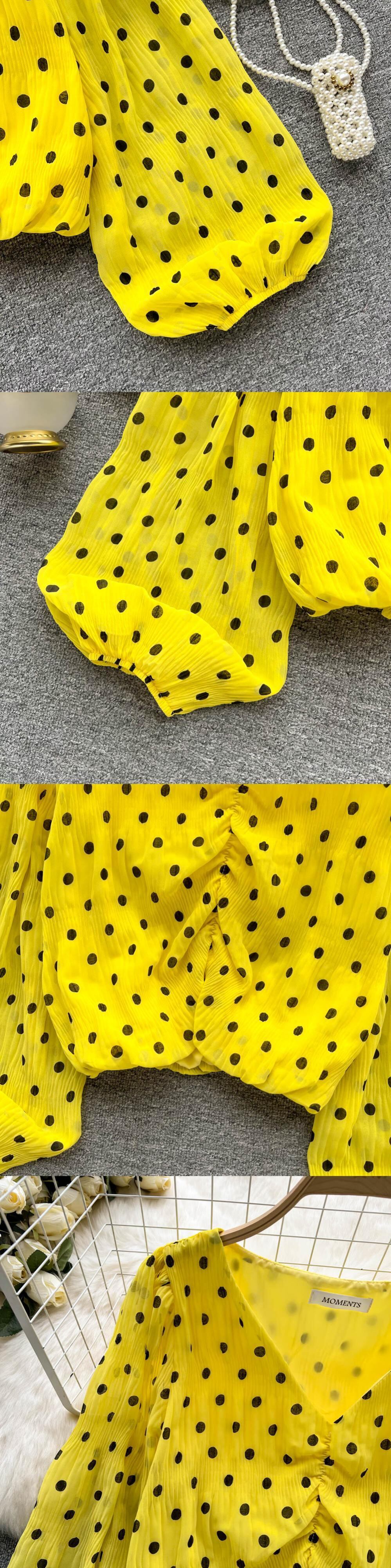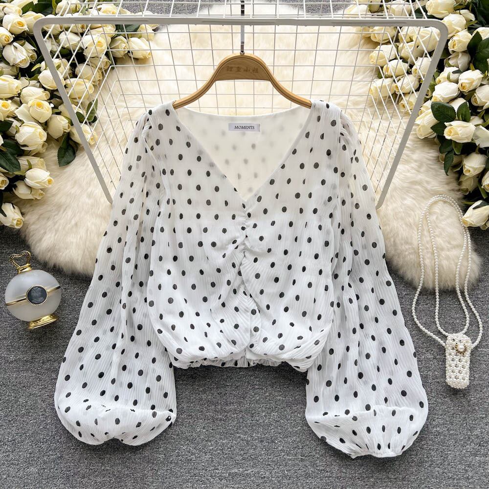 2022 春の新作水玉 V ネックプリーツ気質トップ女性の洋風甘いオールマッチパフスリーブシフォンシャツ 大人ガーリー スウィート キュート カジュアル スプリング 春物 Vネック lyxaj82406556348